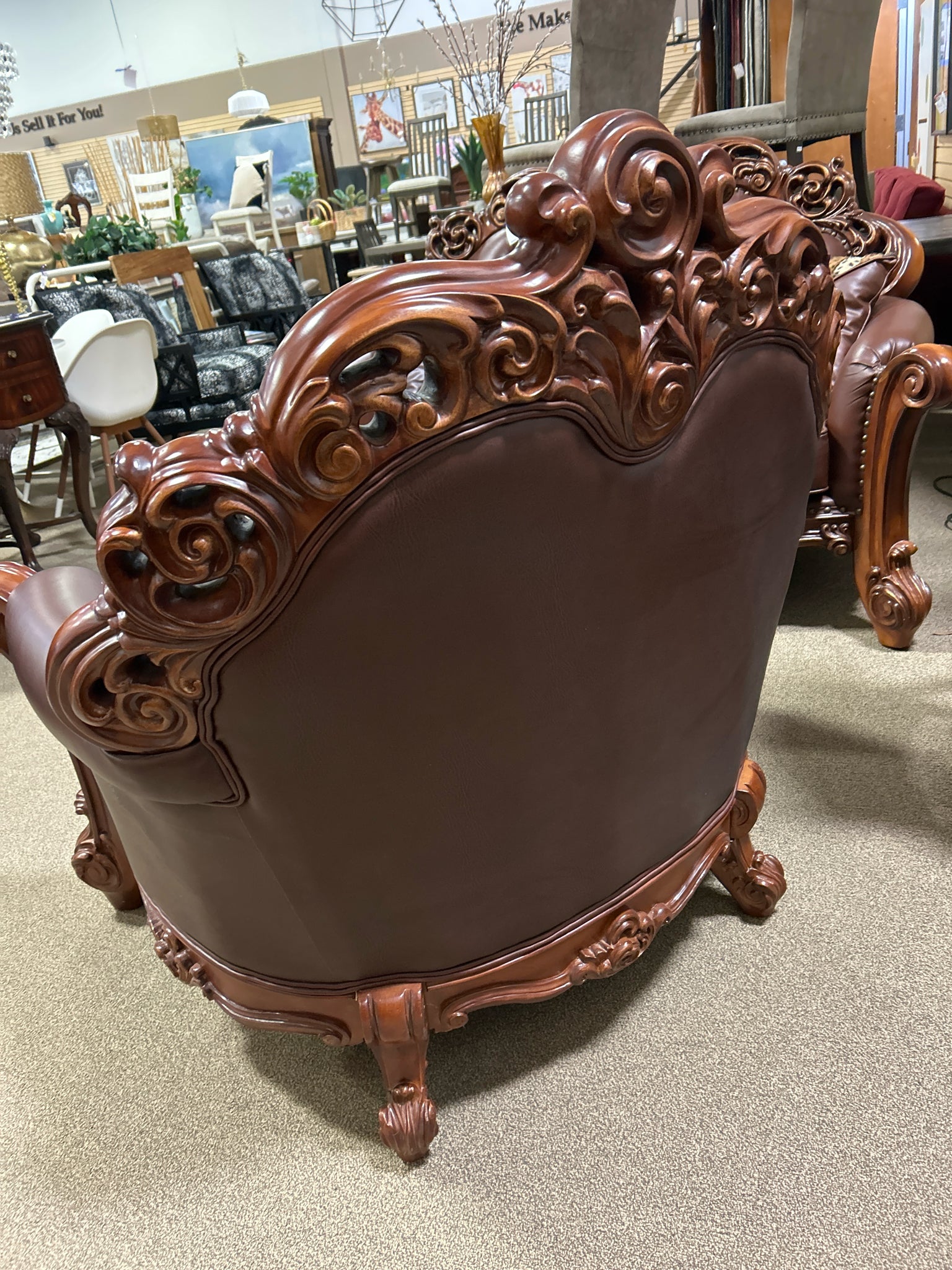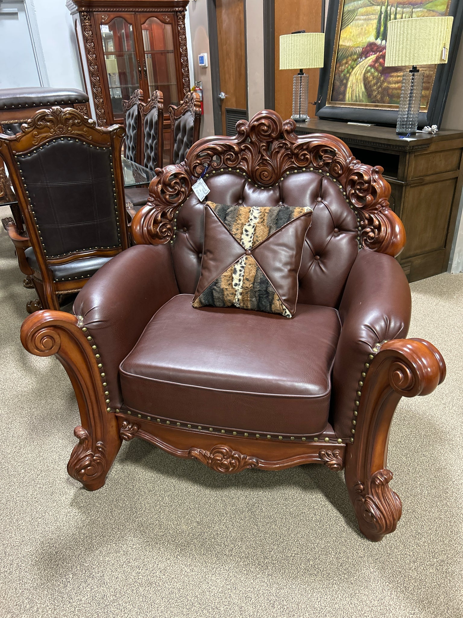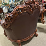 VENDOME CARVED CHERRY WOOD CHAIR W/BROWN LEATHER CHAIR W/PILLOW