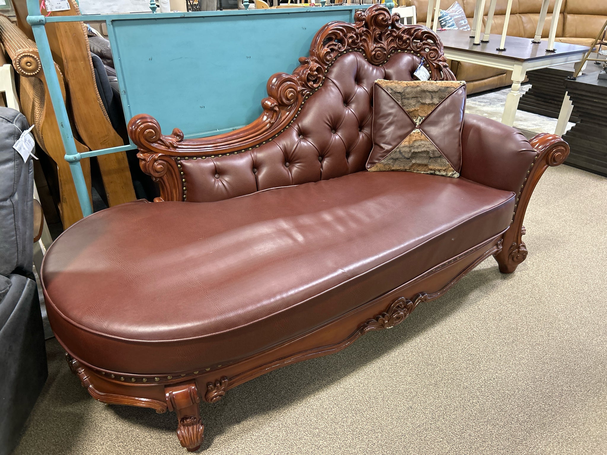 VENDOME CARVED CHERRY WOOD LEATHER CHAISE W/PILLOW 81W 40D 45H