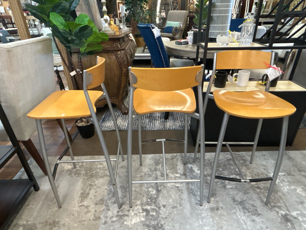 (AS IS - Wear) SET/3 Oak Counter "Baba" Stools on Metal Frame