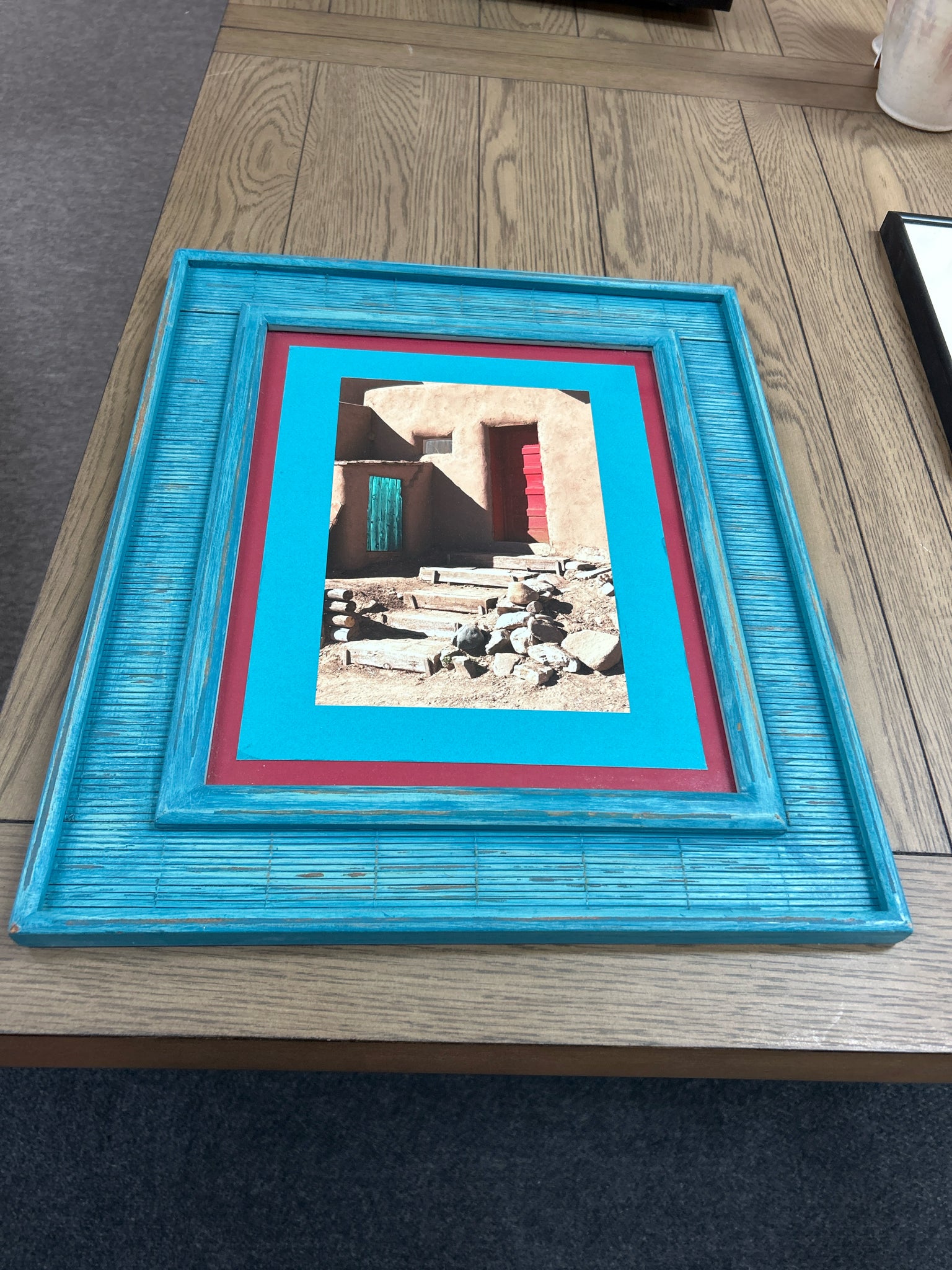 Turqoise Frame Photograph of Adobe House with Red Door. 16"x19 1/2"
