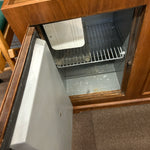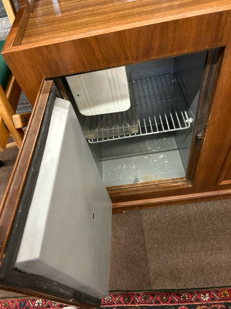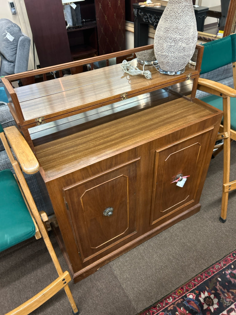 Brown Wood Vintage Lift Top Bar w/ Mini Fridge, Mirror Splashback 42"LX18"WX48"H (AS IS- Wear)