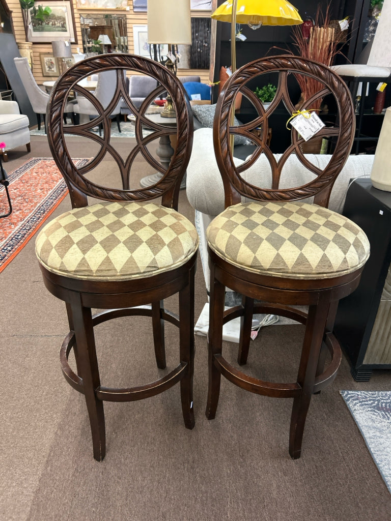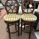 (AS IS - Wear) Set/2 Swivel Dark Brown Bar Stools W/ Diamond Design Upholstery