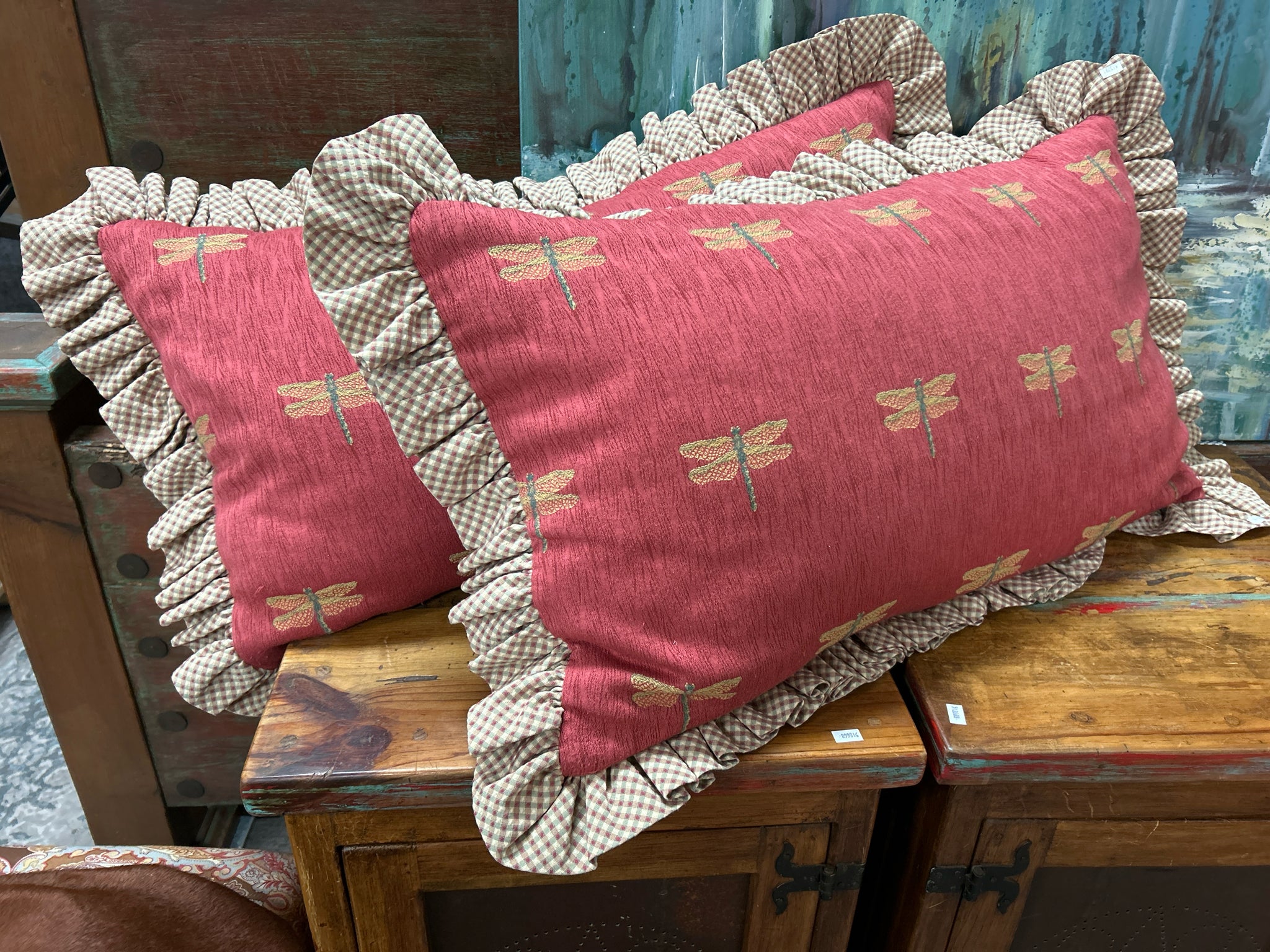 Set King size Comforter Green Rust Dragonfly and flowers, with 2 Large dragonfly lumbar pillows, 3 euro shames.