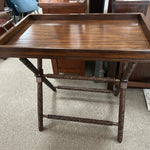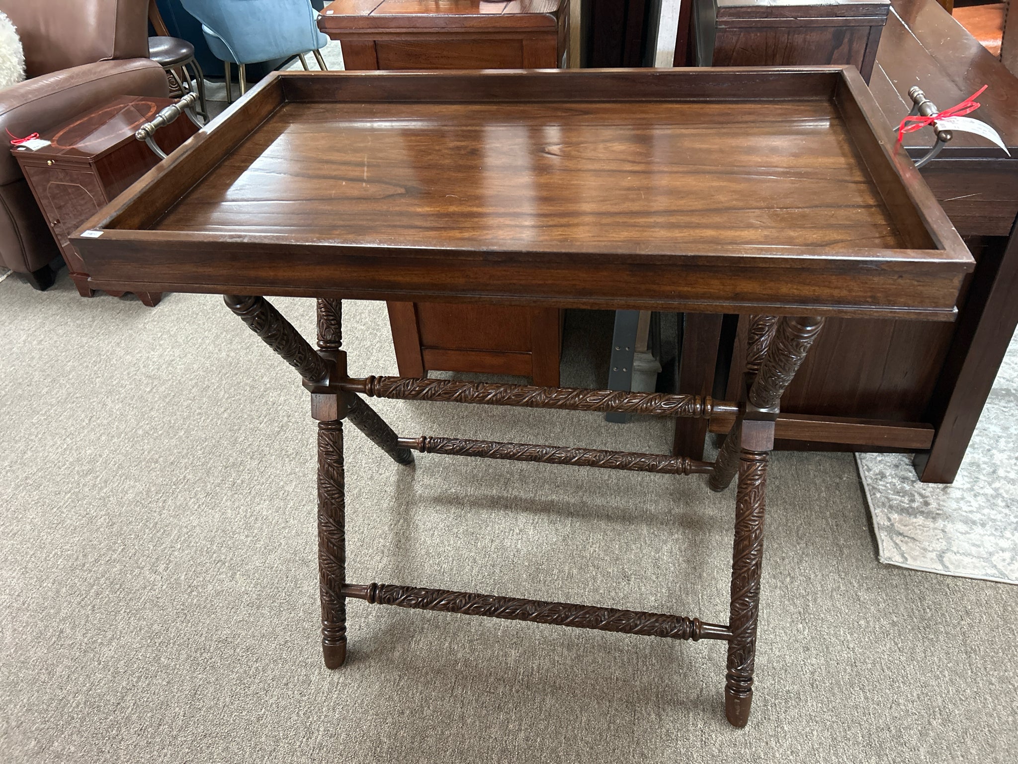 Dark Wood Tray-Top(attached) Table w/ Carved Wood Legs, Metal Handles - 40"x24"x36"h