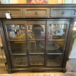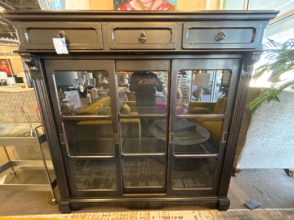 (AS IS) Lighted Black Display Cabinet W/ 3 Drawers & 2 Sliding Doors