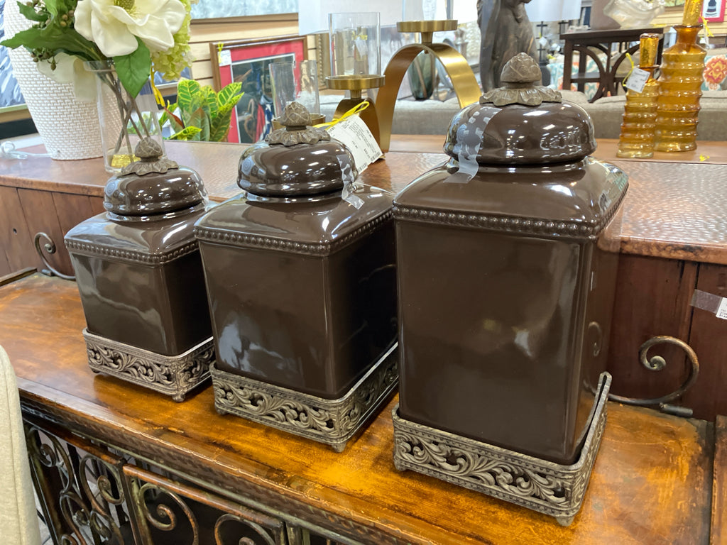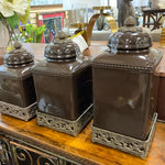 SET OF THREE GRACIOUS GOODS LARGE CANISTER'S W/ACANTHUS LEAF & METAL BASE