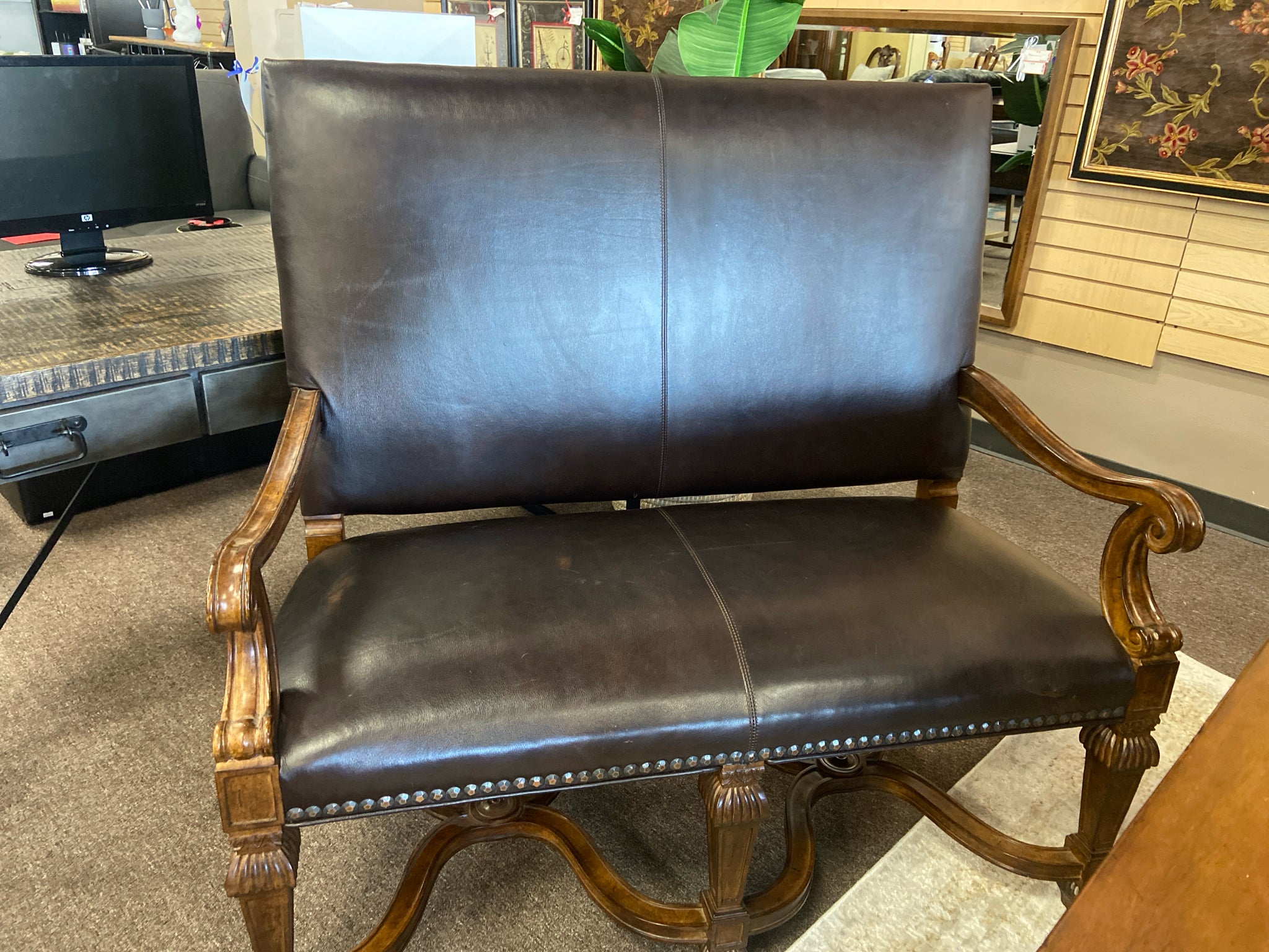 Brown leather Settee w wood frame (asis)