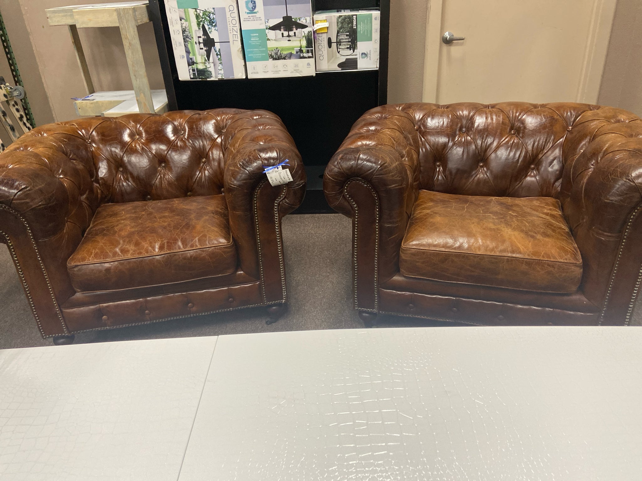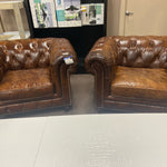 Set of 2 Brown chestfield tuft on castor arm chairs (asis wear)