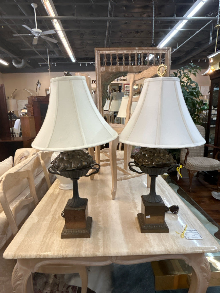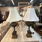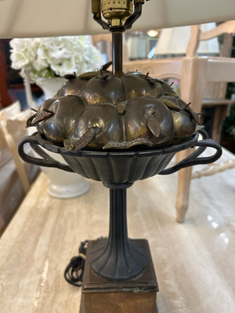 (AS IS - Needs Cleaning/Mismatched Finials) SET/2 Brass & Iron Urn W/ Basket of Apples Sculpture Lamp 30"H