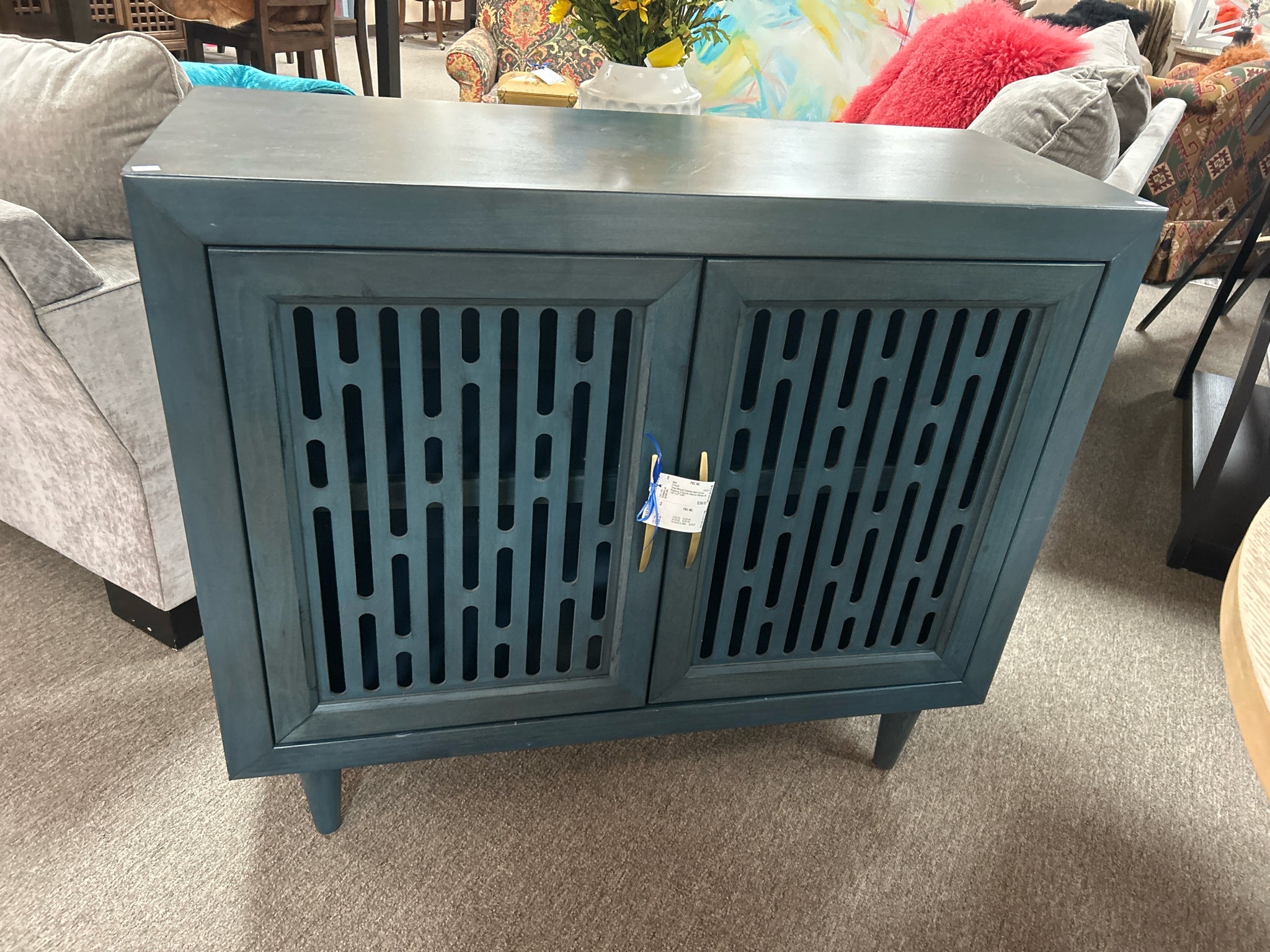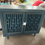 Teal Wood Cabinet with Cut-Out Pattern 2 Doors. Interior Shelves. 40 1/2"x17"x34"