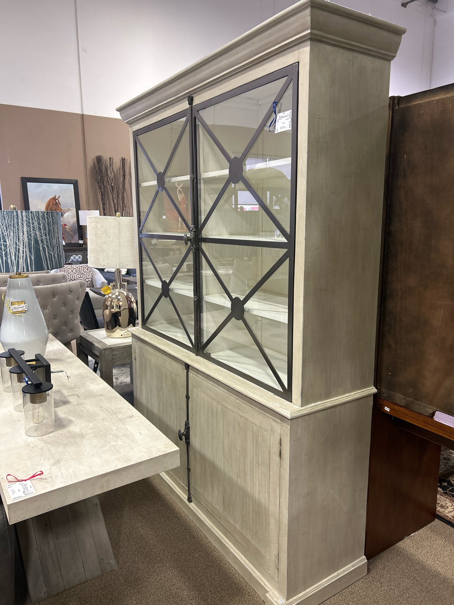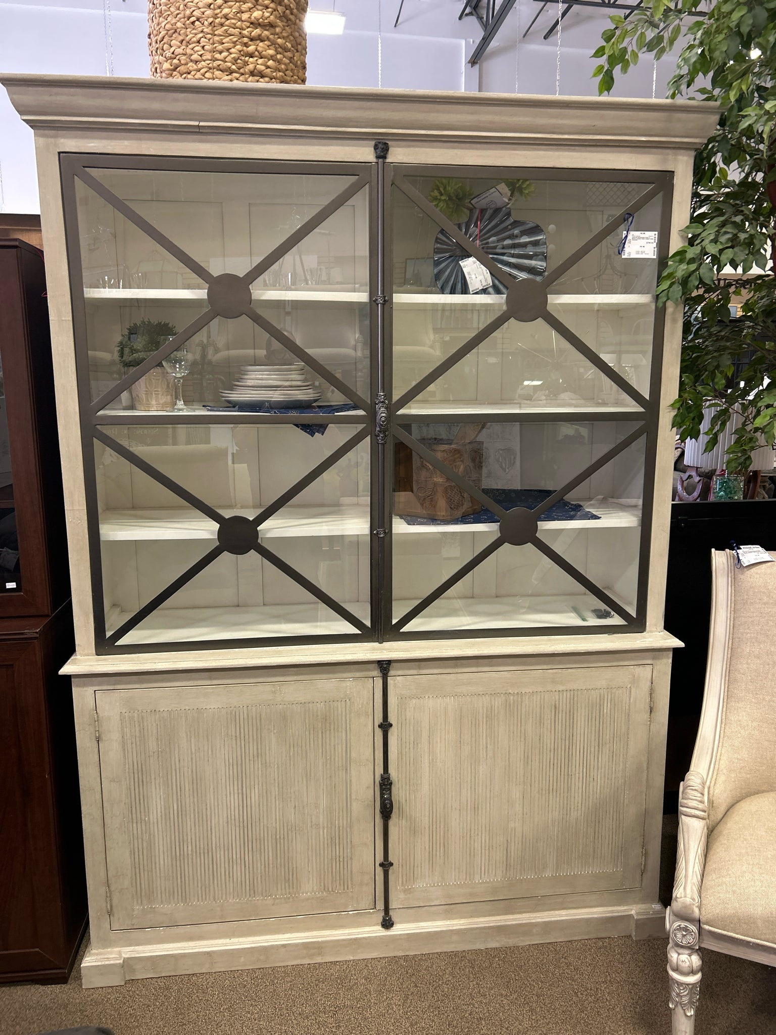 PAVILION DISTRESSED IVORY & METAL 4-DOOR CHINA CABINET 605W 18.5D 84H