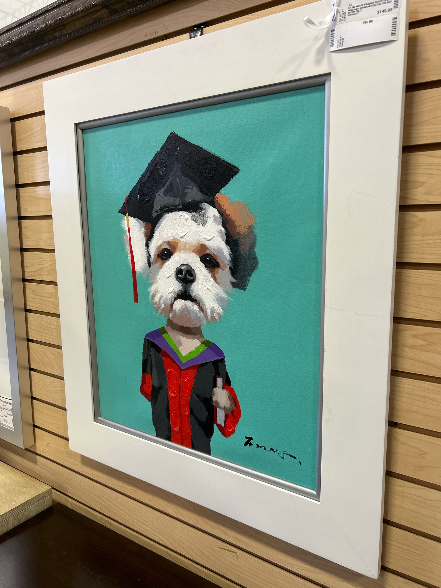 H1384-WHITE FRAMED PUPPY DOG W/BLACK GRADUATION CAP ON ART WORK 28.32