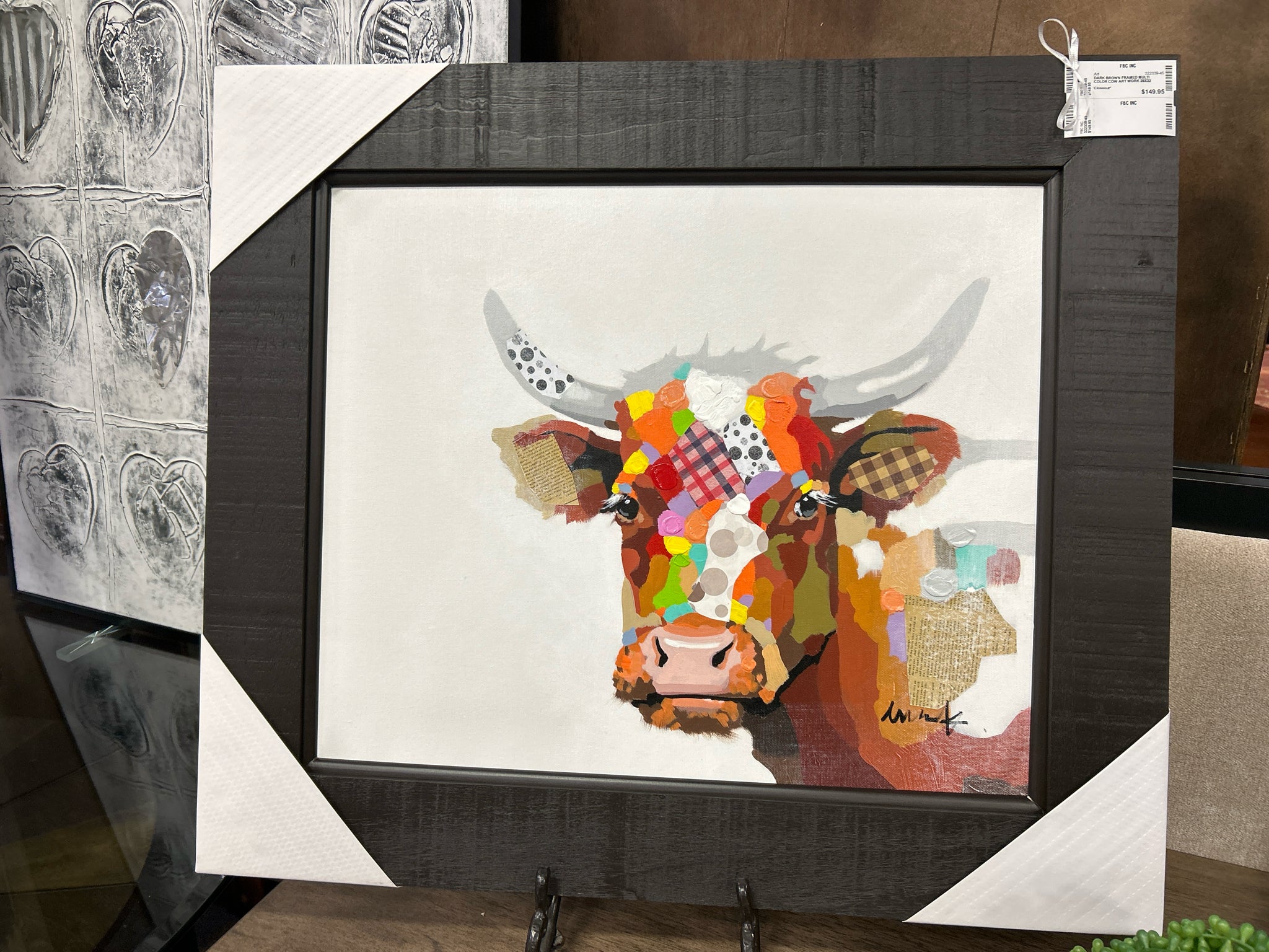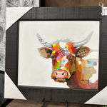 DARK BROWN FRAMED MULTI COLOR COW ART WORK 28X32