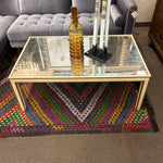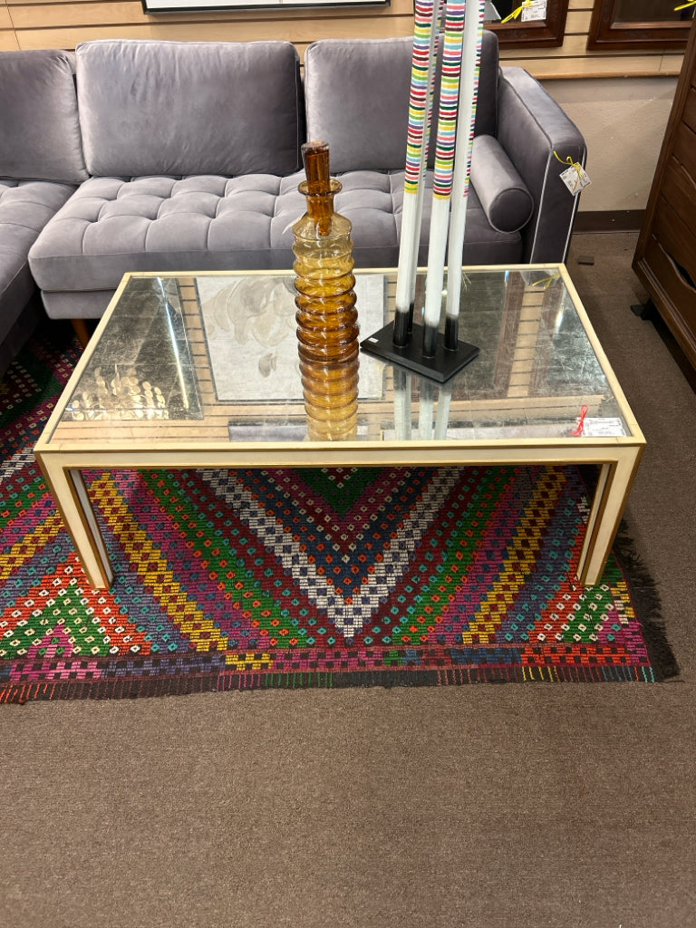Light Colored Rectangular Coffee Table W/ Gold Accents & Antiqued Mirror Top