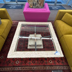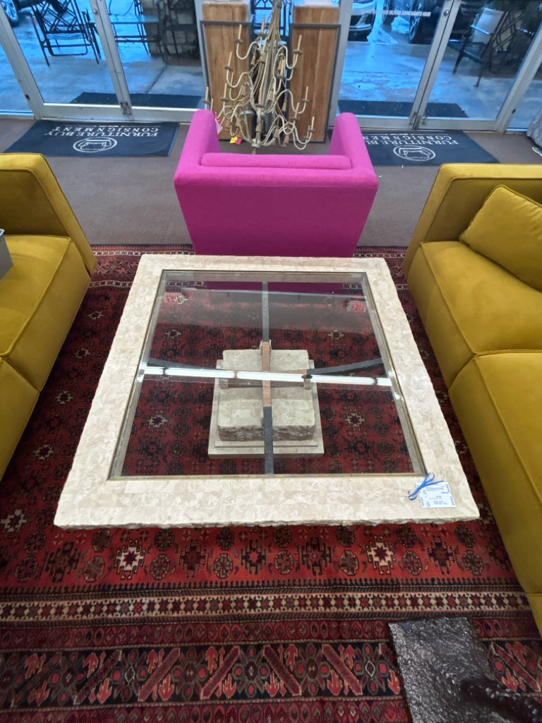 (AS IS) Beveled Glass in Square Travertine Frame & Base W/ Metal Support Feature