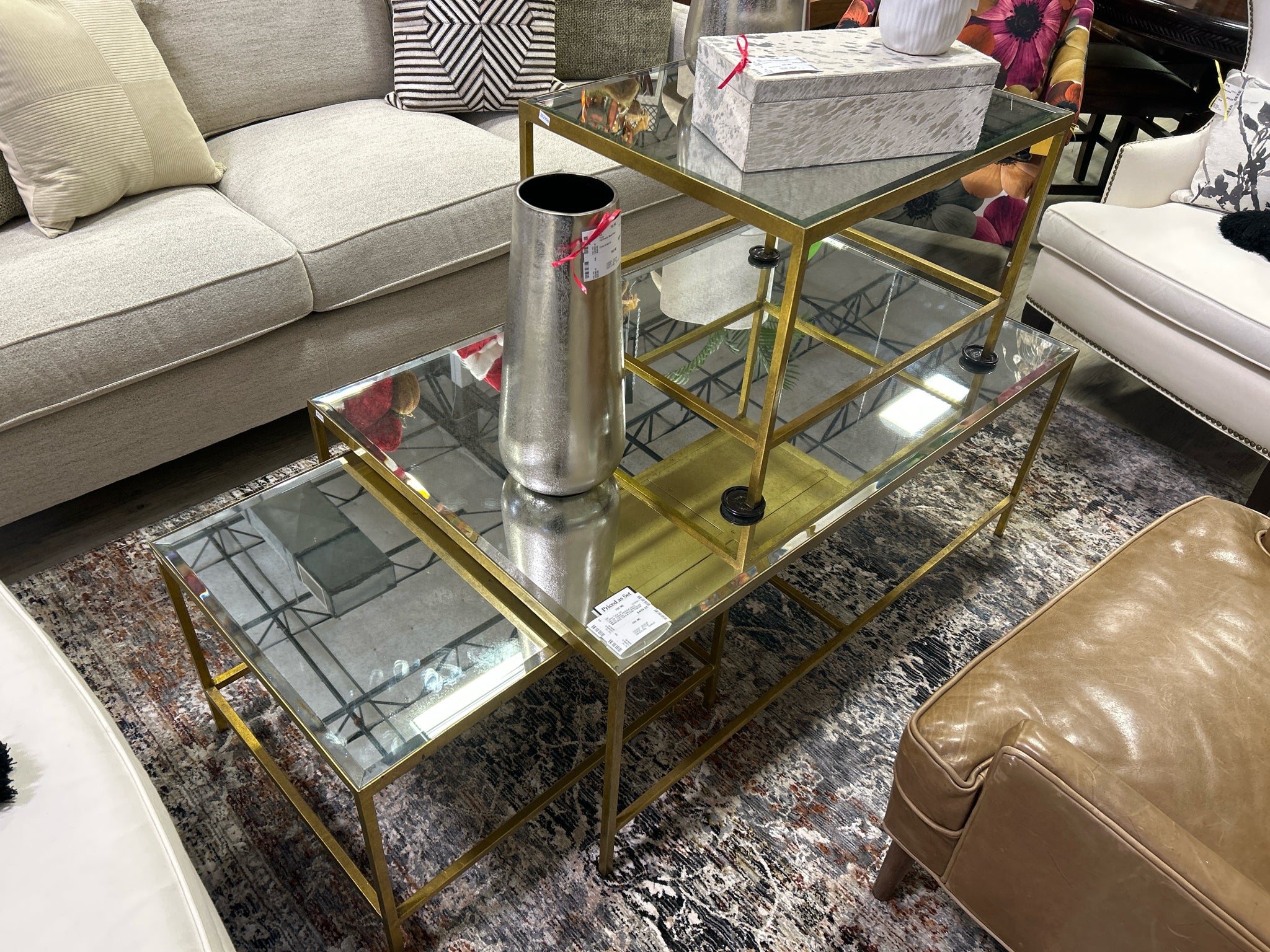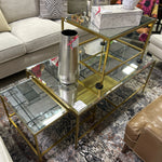 SET OF THREE ANTIQUE GOLD METAL COFFEE TABLE W/BEVELED MIRRORED TOPS & 2-END TABLES