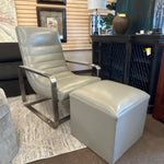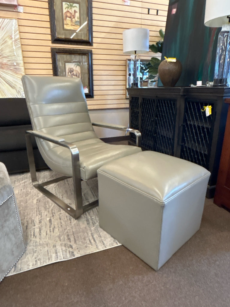 SET/2 Channel Tufted Taupe Leather on Sleek Silver Frame Chair W/ Matching Ottoman
