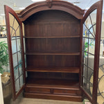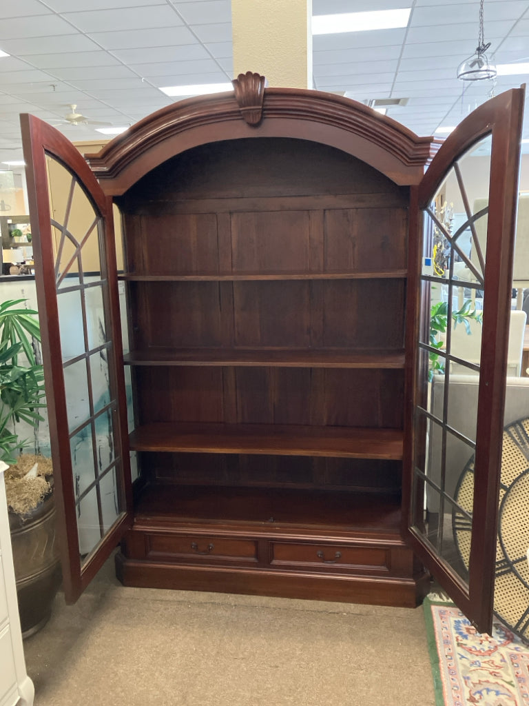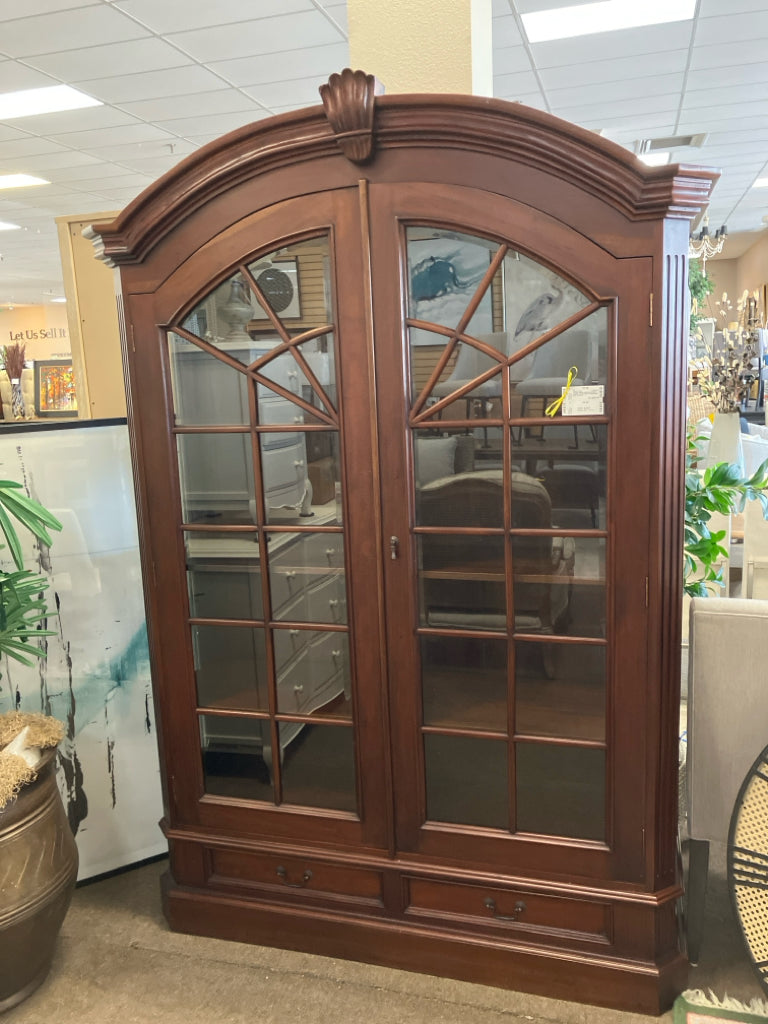 CHERRY WOOD ARCHED DISPLAY CABINET W/2-DOORS & 2-DRAWERS 56W 17D 82.2H