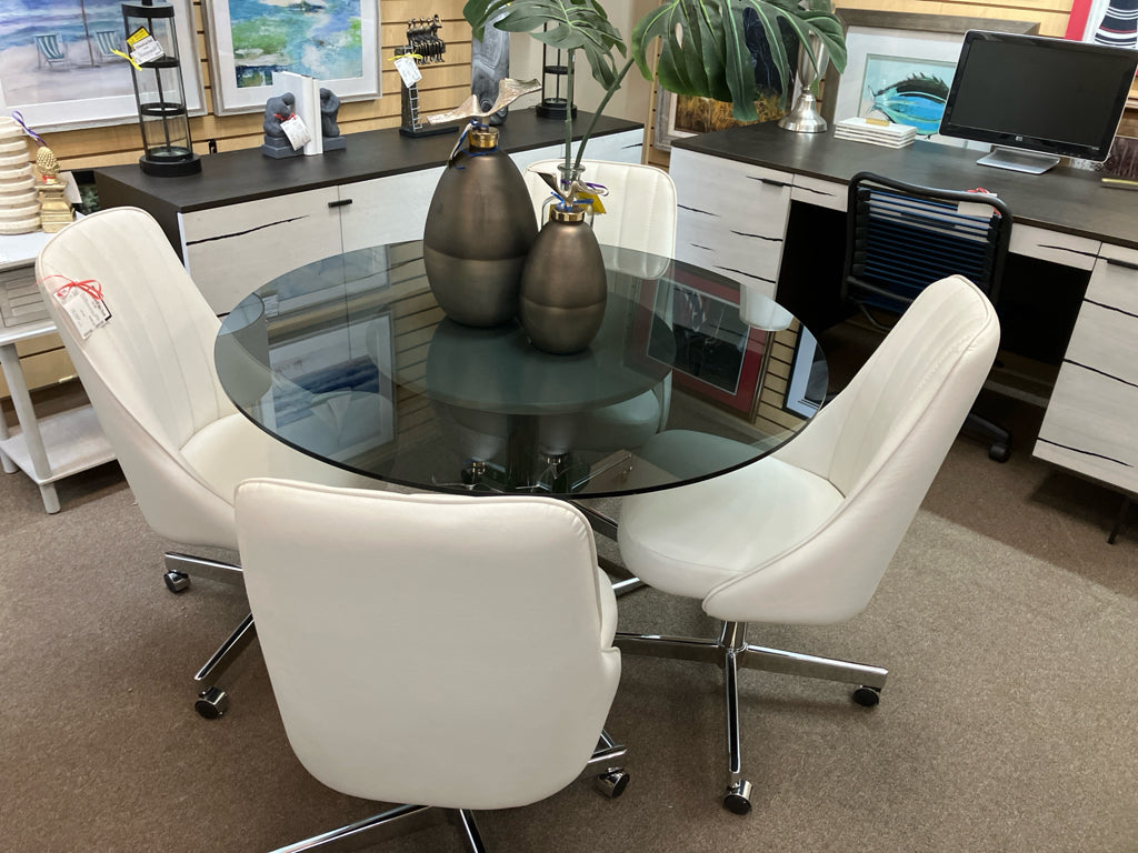 Small Smoked Round Glass Table w/4 Leather-like Chairs on Casters