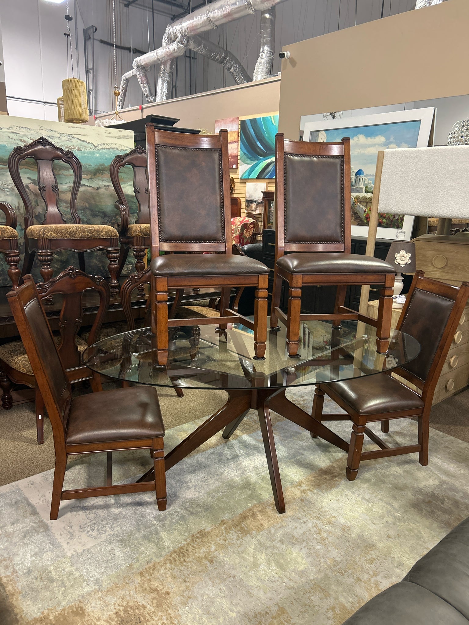 AS IS Oval Glass Table w/4 Wood & Leather Chairs
