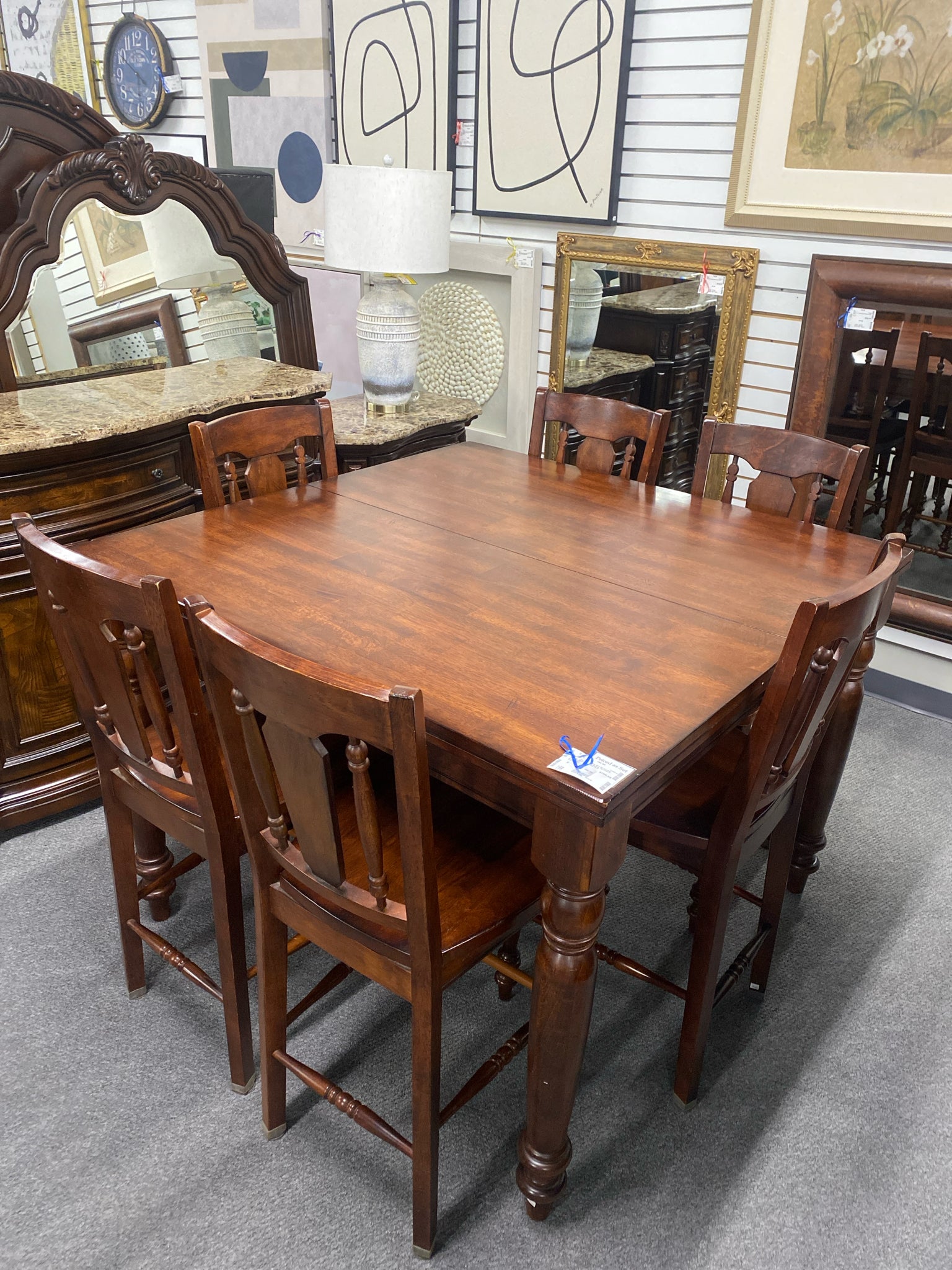 Dk Cherry Finish 48"x 48" Counter Height Table w Built-In 18" Leaf, 6 Chairs, and Table Pads