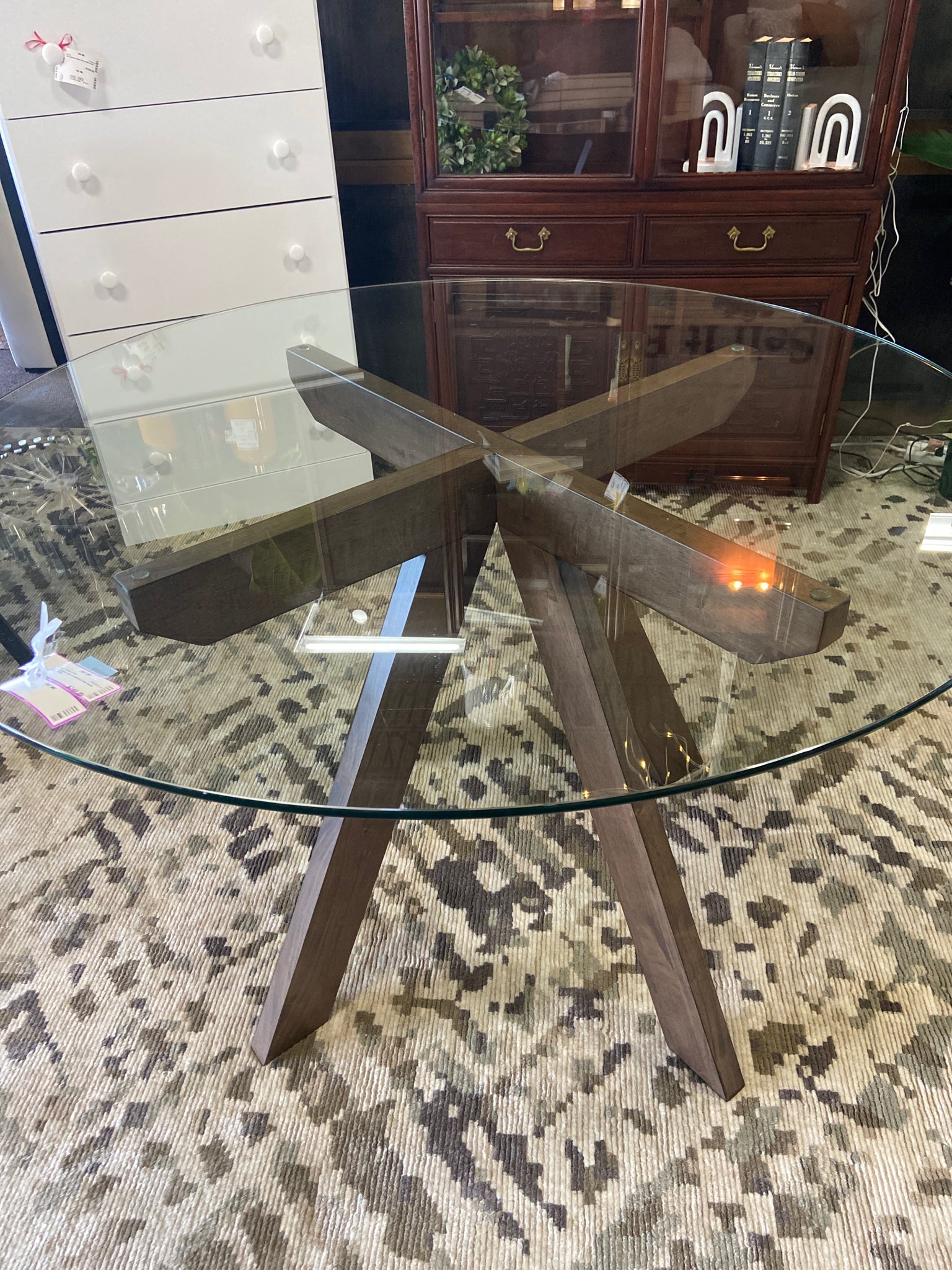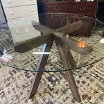 Round glass top w wood 4 leg base dining table