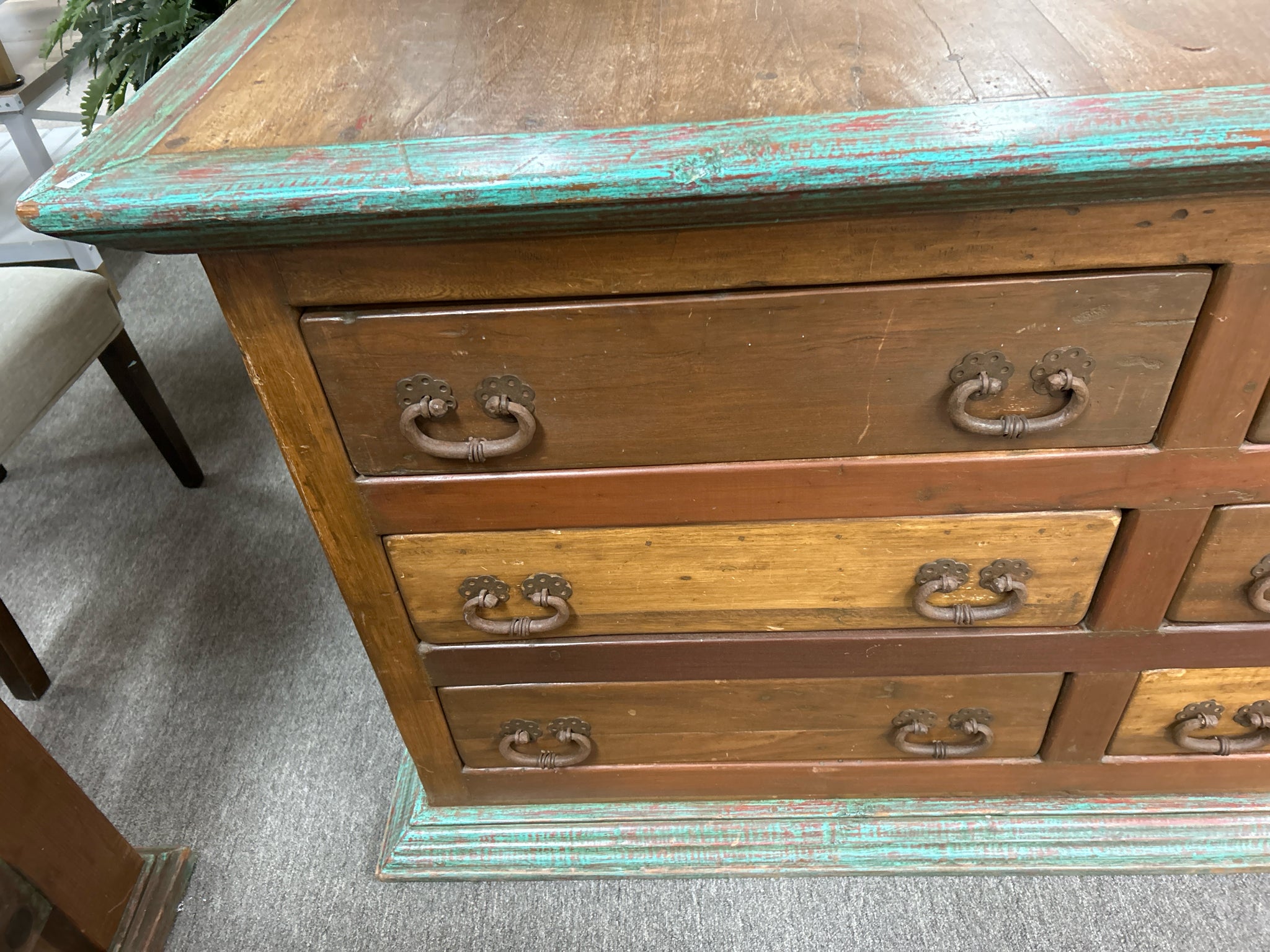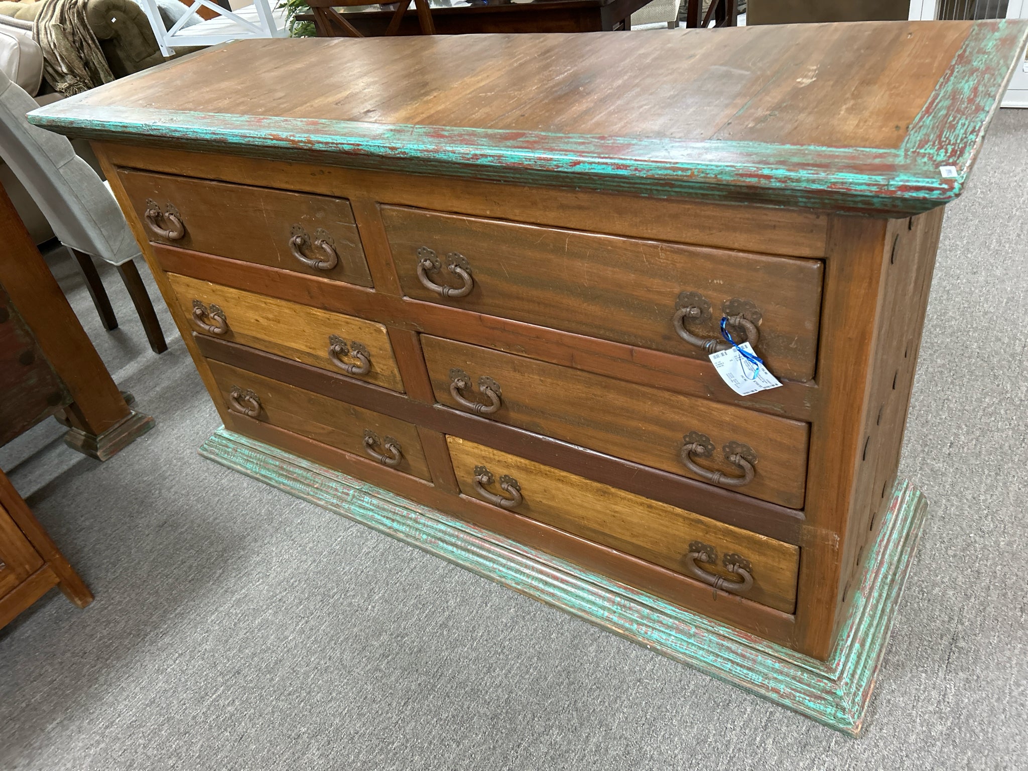 Rustic Turqoise,Red Wood 6 Drawer Dresser, Large Iron Hardware. 68 1/2"x23"x38"