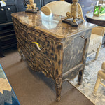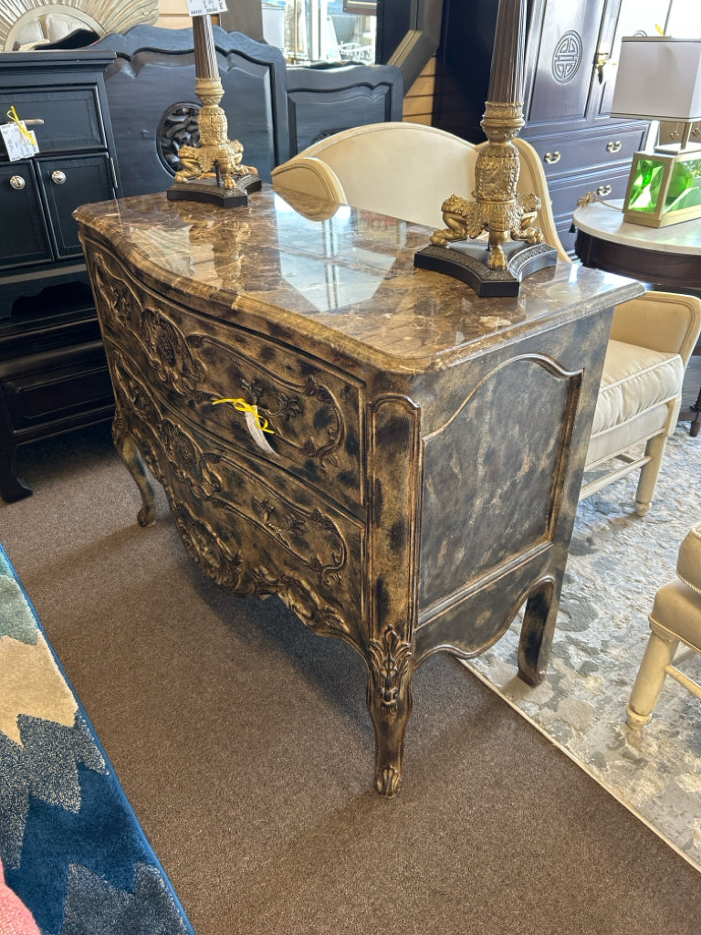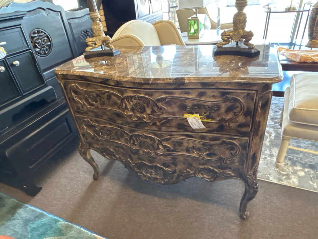 Distressed Gold Over Dark Wood 2-Drawer Ornately Carved W/ Marble Top Chest