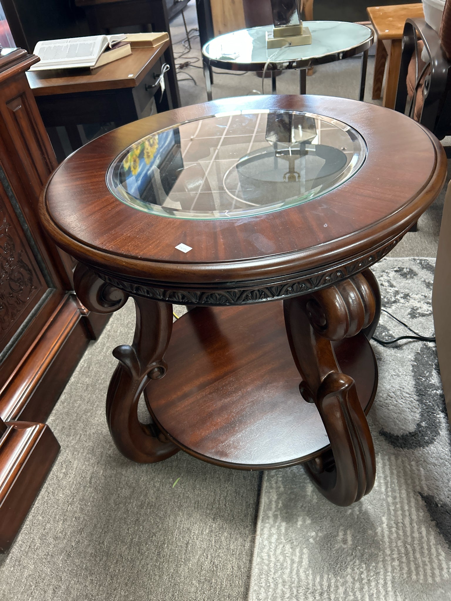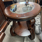 26" Round Glass Top Inset/Dark Cherry Wood End Table,Curved Legs. 26" Tall
