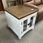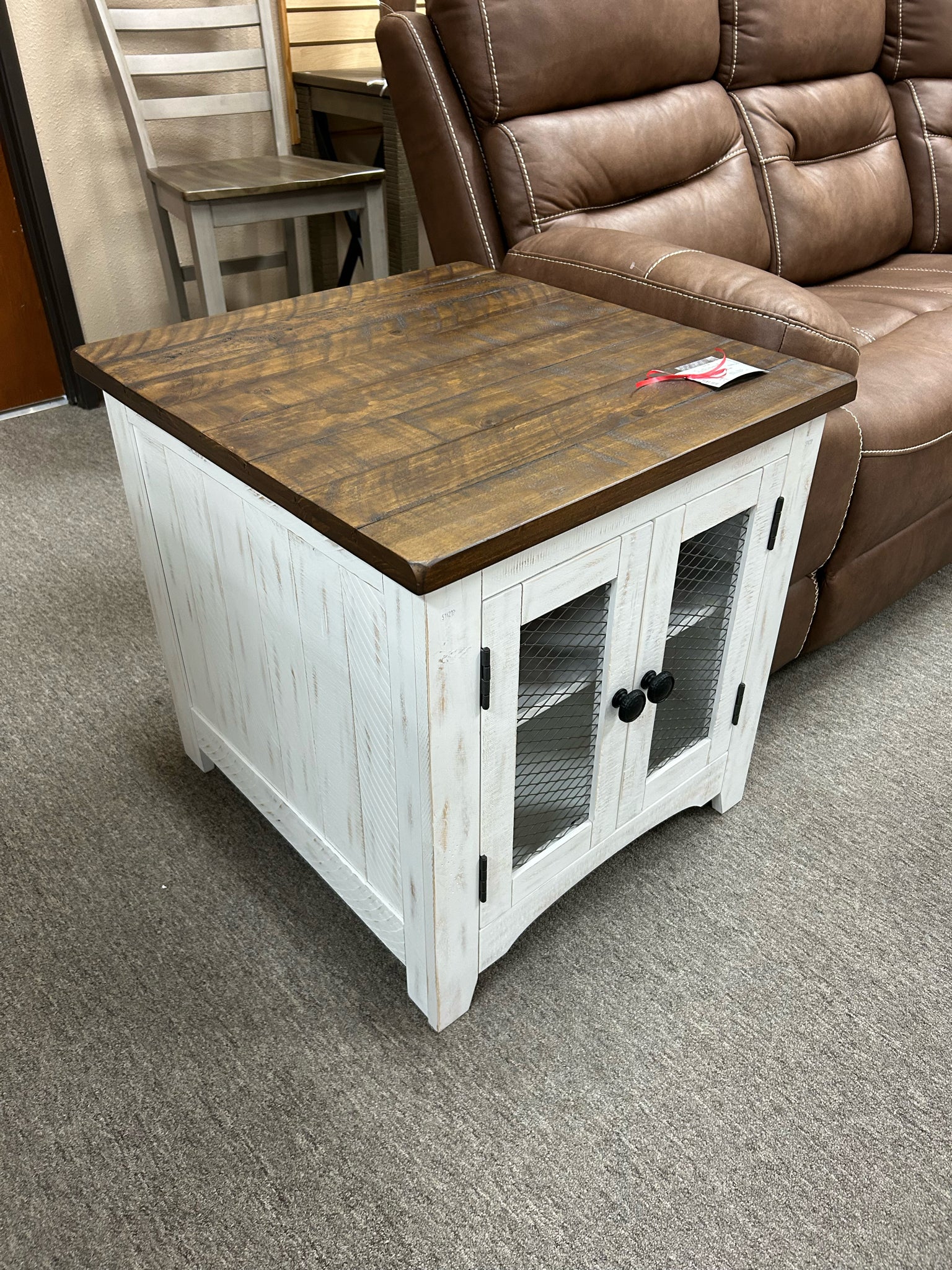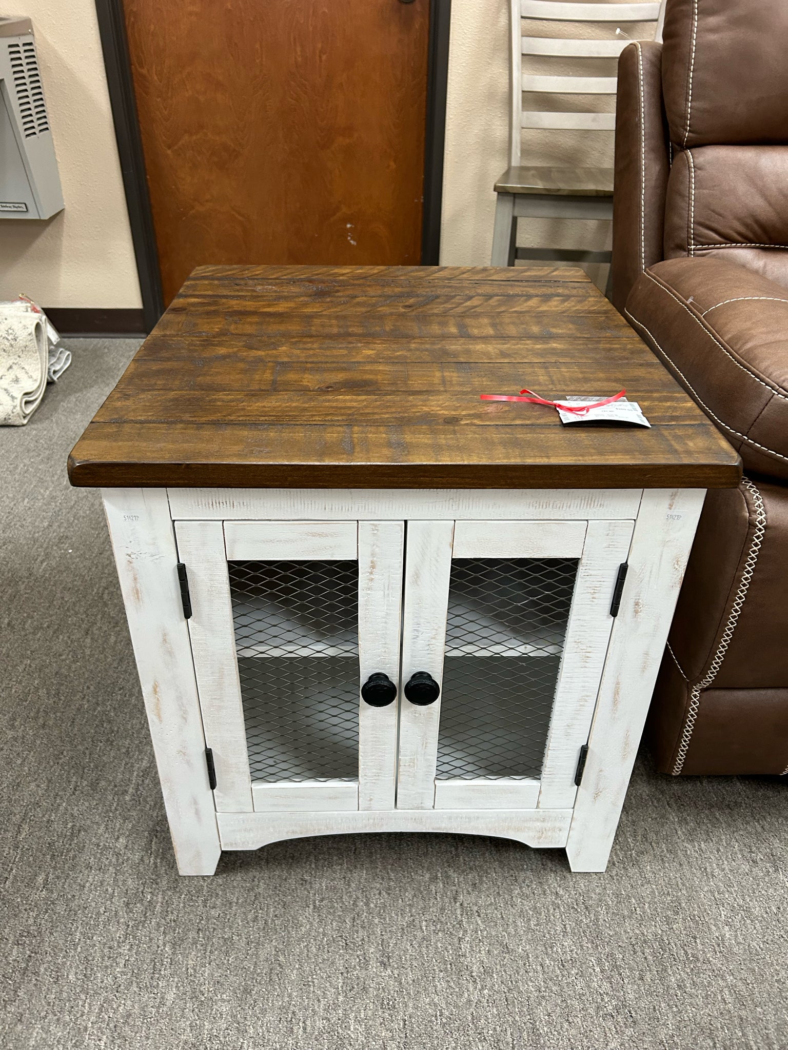 White End Table with Plank Wood Top, 2 Wire Doors. 24x26x25" tall
