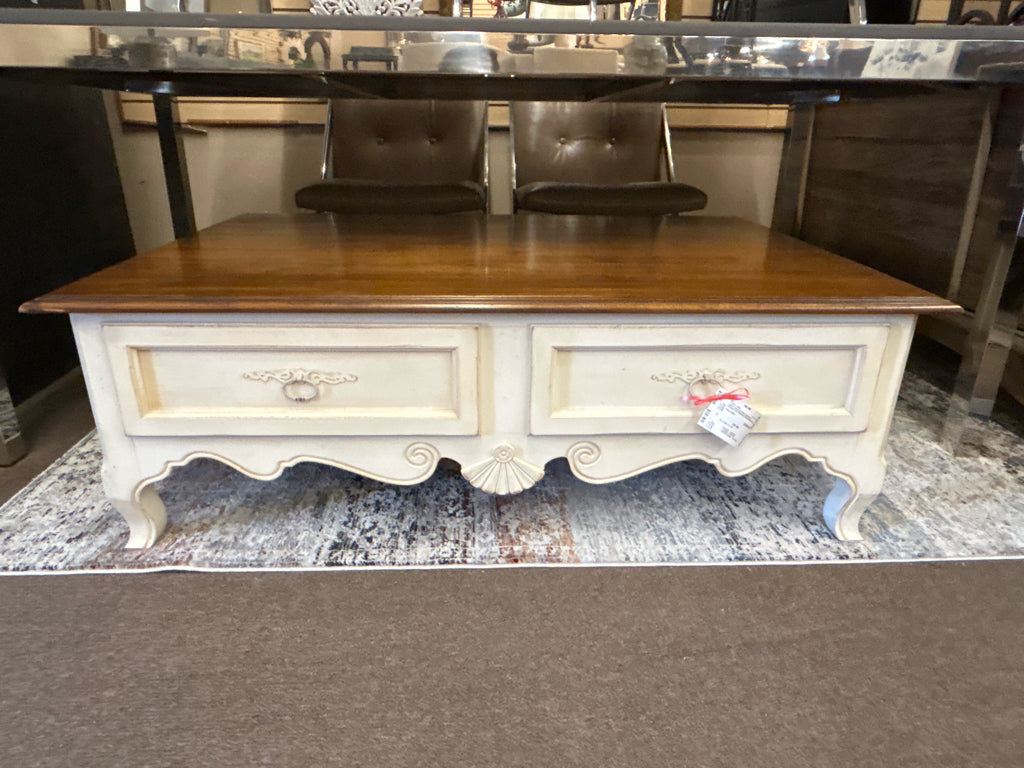 Light Colored Coffee Table W/ 2 Drawers and Medium Finish Wood Top