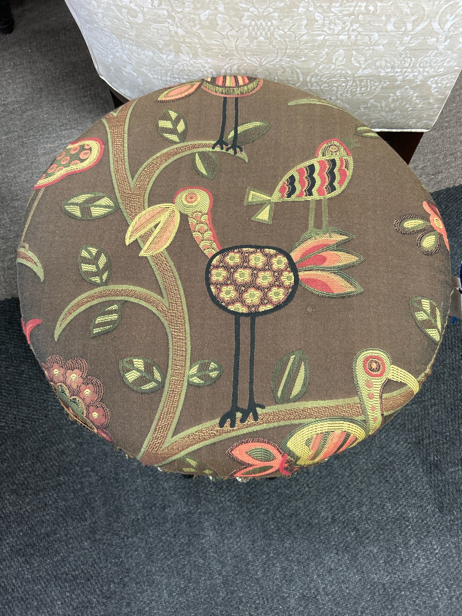24" Round Brown Silk Fabric with Bird Motif/Dangling Crystals