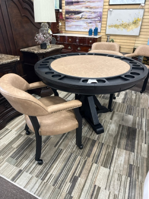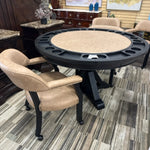 RL500K-GT-D6PC round black game table top on round black table 4 tan and black chairs on castor