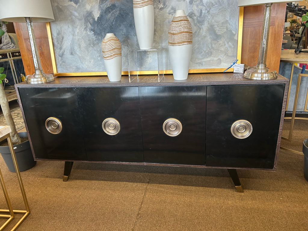 (AS IS) Dark 4-Door Sideboard W/ Alligator Textured Top & Sides & Round Brushed Gold Hardware