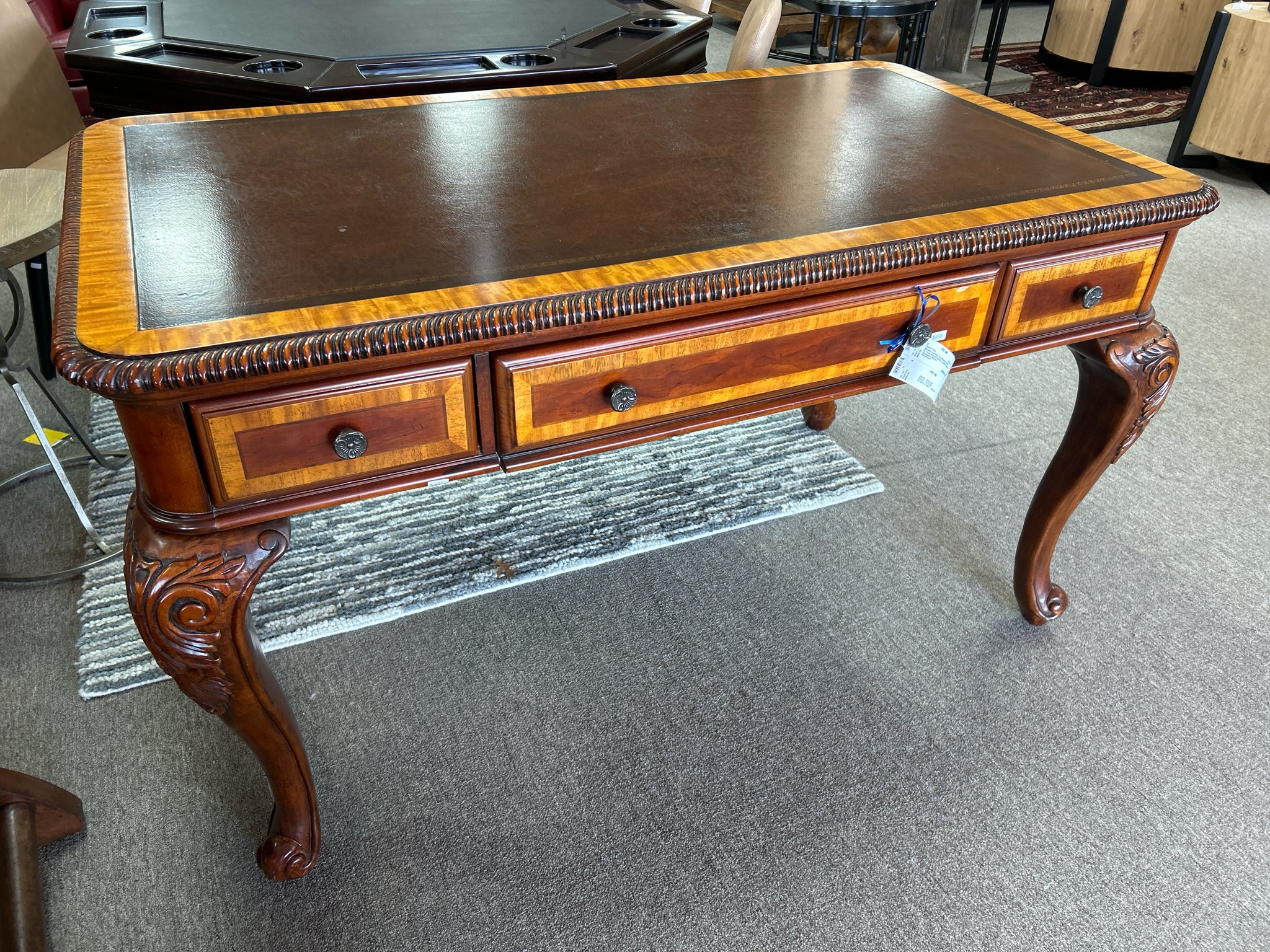 Brown Leather Top Writing Desk 2-Tone Wood Finish, Curved Legs, 3 Drawers. 55x31"