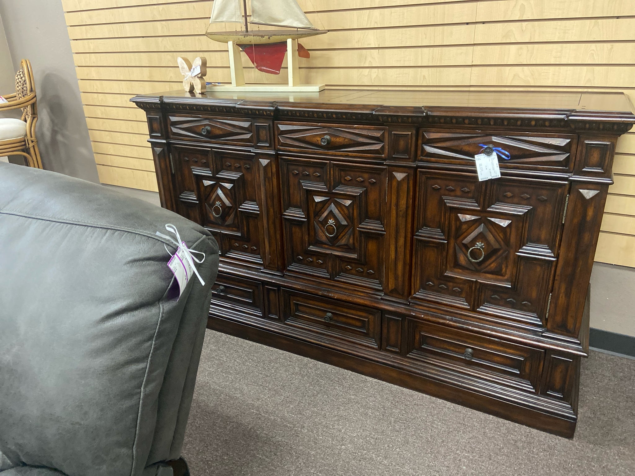 Dark wood carved 6 drawers 3 door carved cabinet/server/buffet