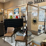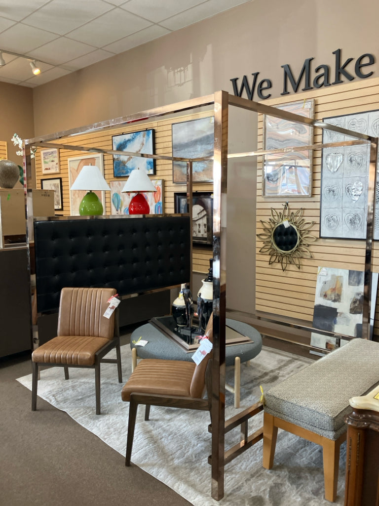 KING-MIRRORED BRONZE METAL CANOPY BED W/FAUX BLACK LEATHER & TUFTED HEADBOARD ,SIDERAILS,SLATS