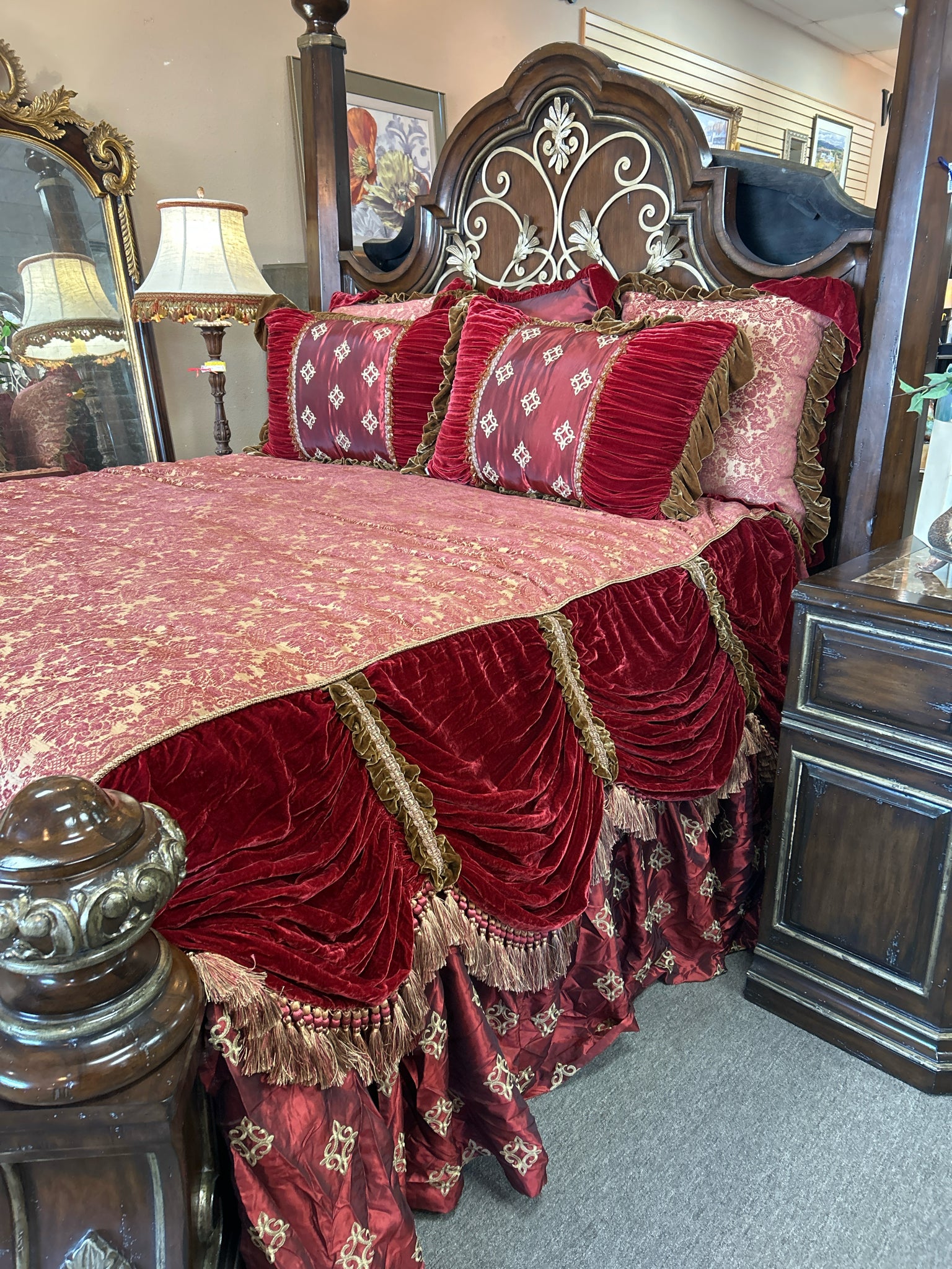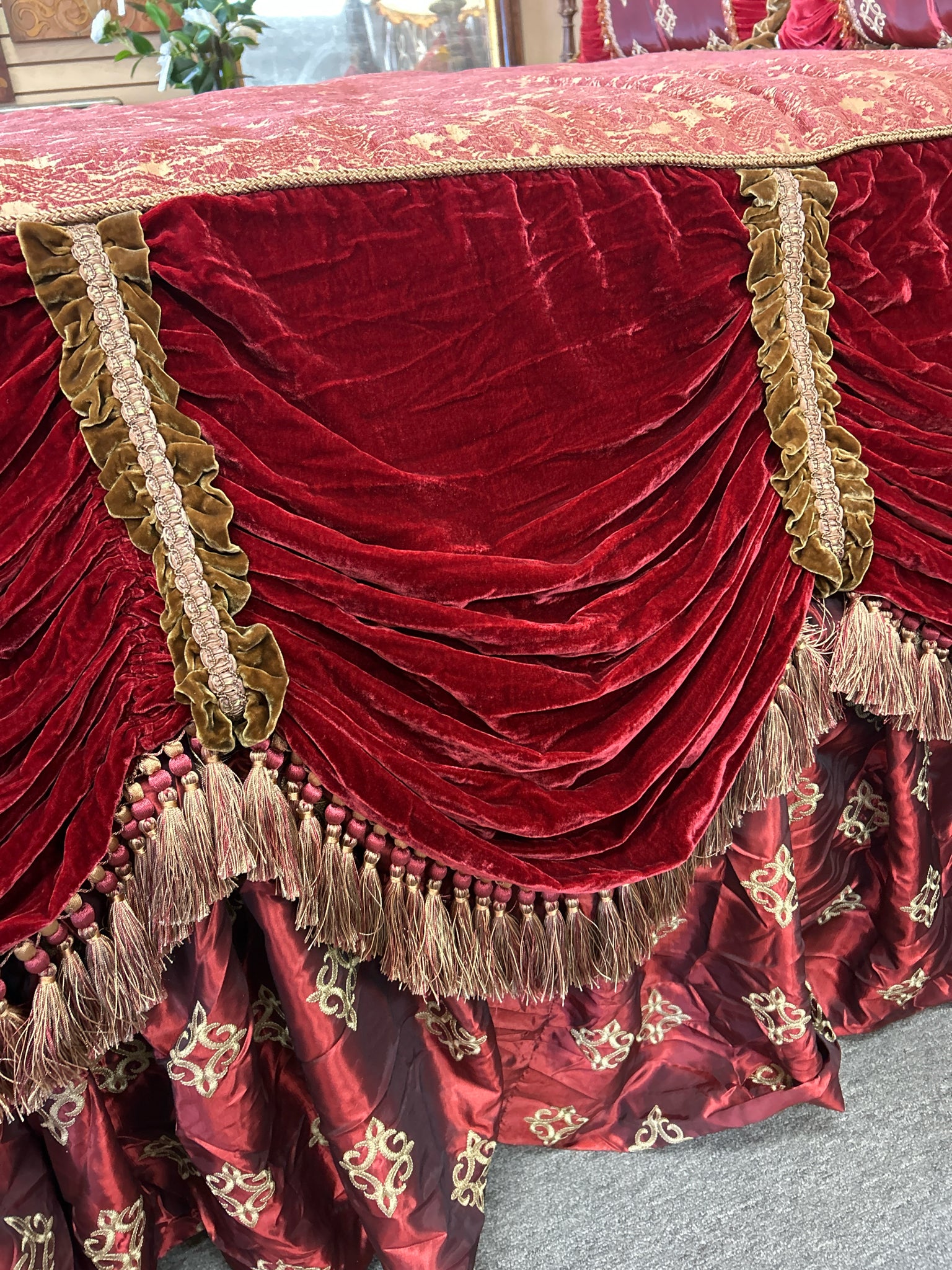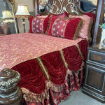 SET of 6 - Burgundy & Gold Silk/Velvet Comforter, 3 Euro Square Pillows, 2 Rectangular Pillows