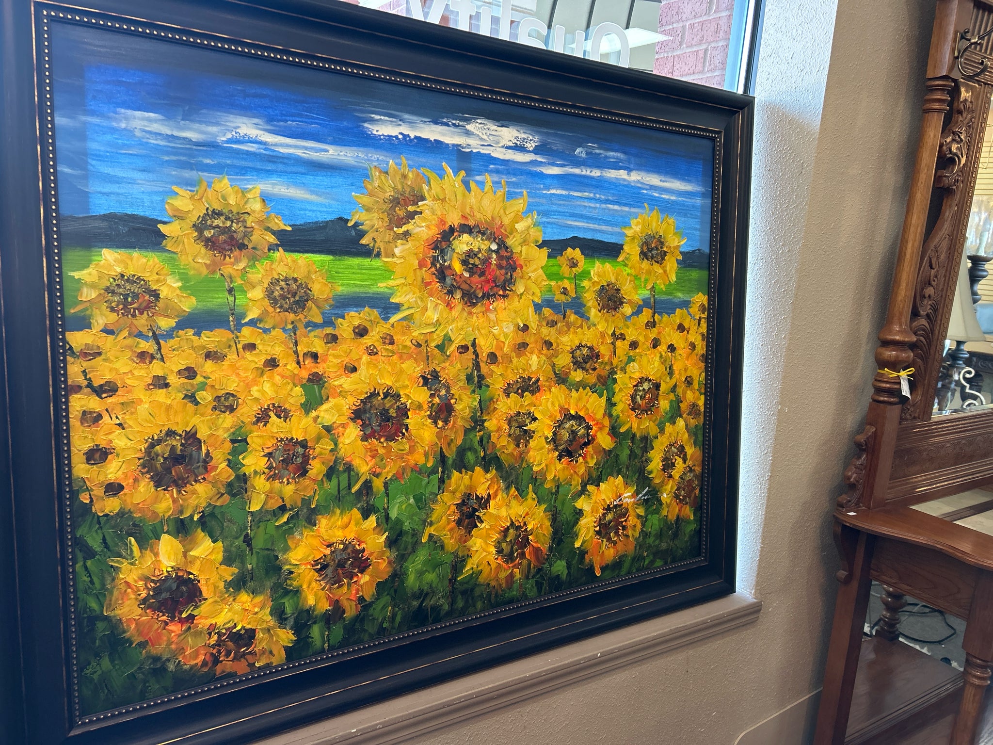 Blue Sky Sunflowers Painting in Dark Frame 44"x 56"