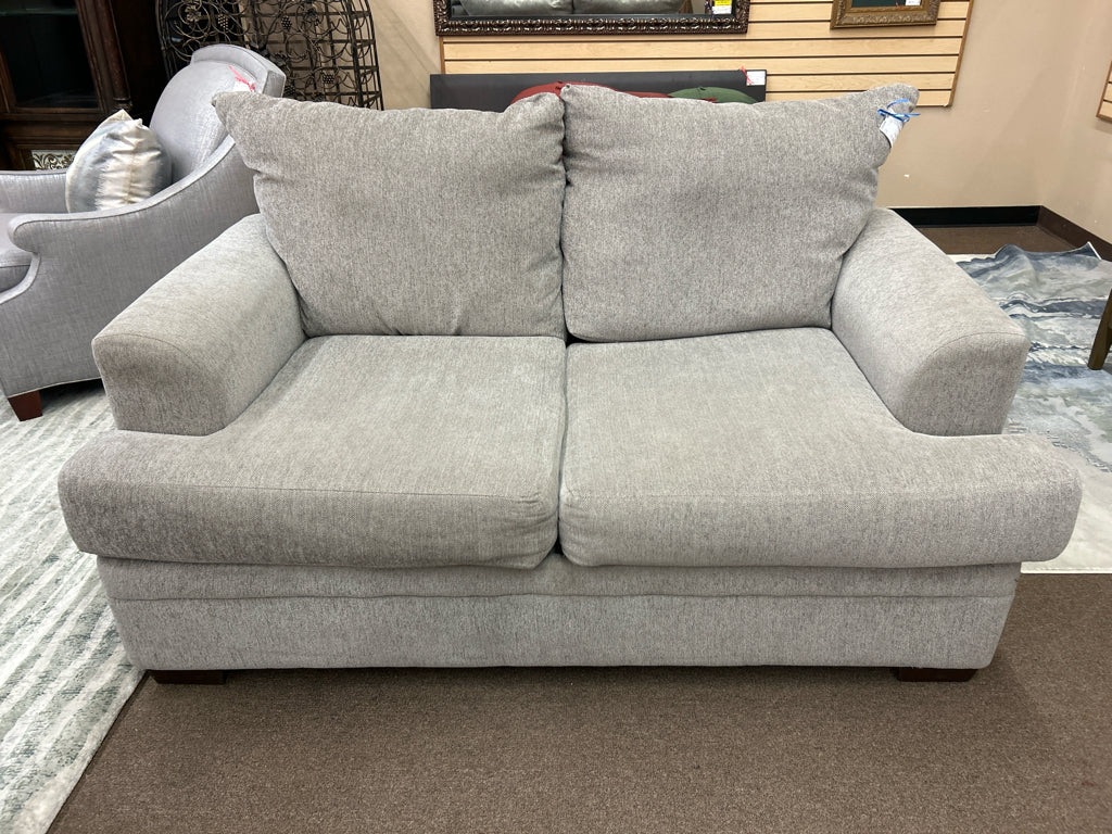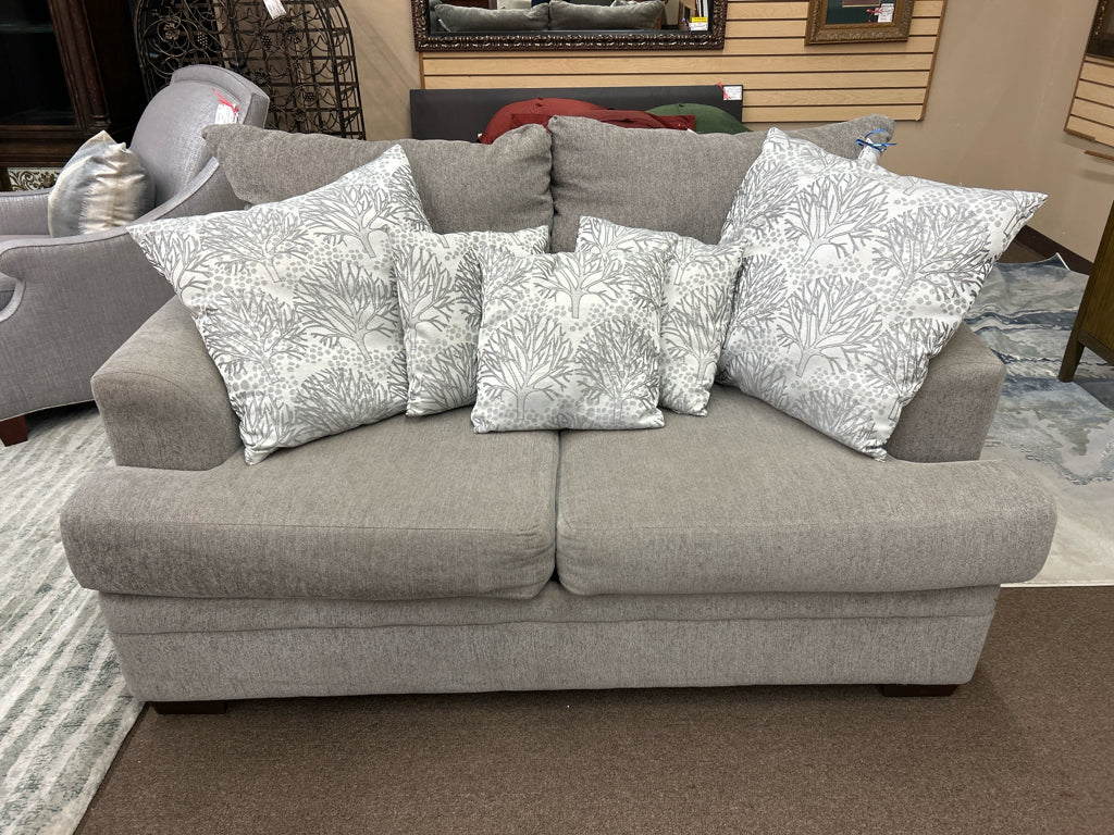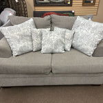 (AS IS - Wear) Grey Upholstered Loveseat W/ 5 White Silver Throw Pillows
