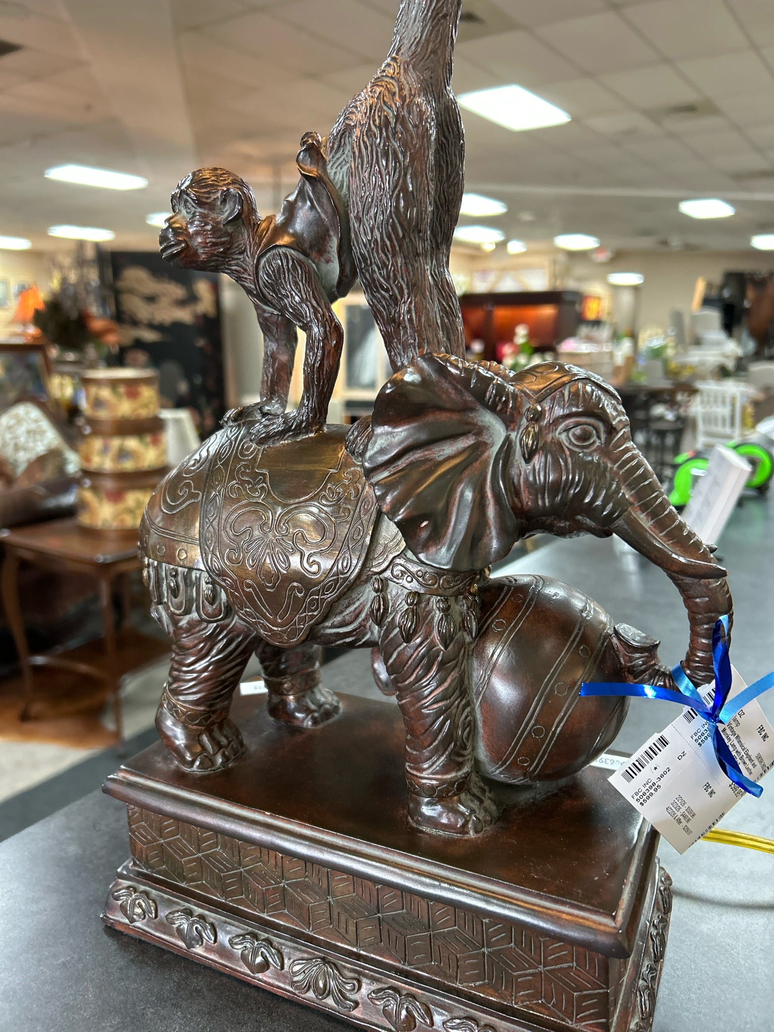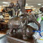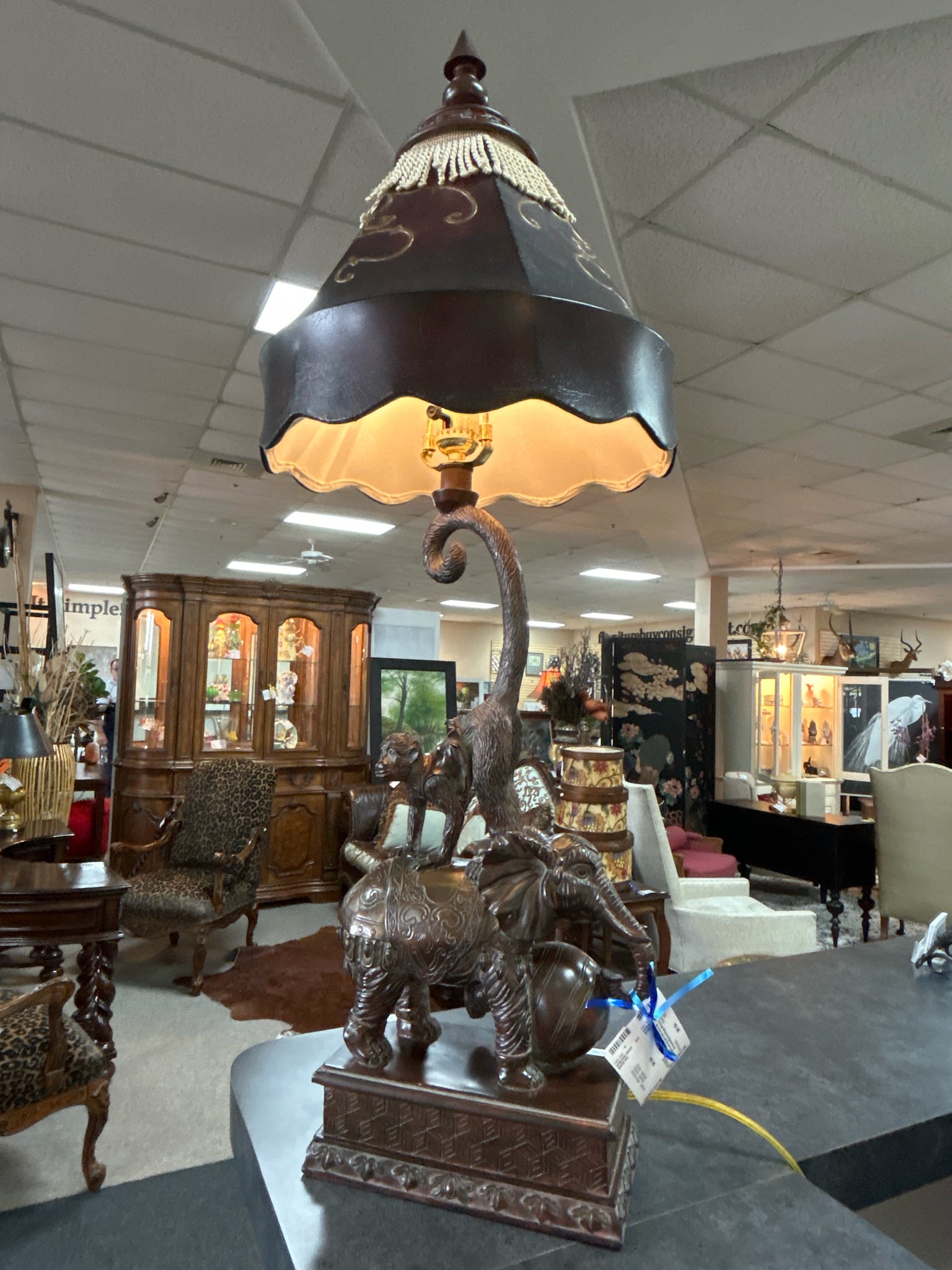 Vintage Whimsical Elephant and Monkey Lamp with Brown Leather Scallop Shade. 37" tall.