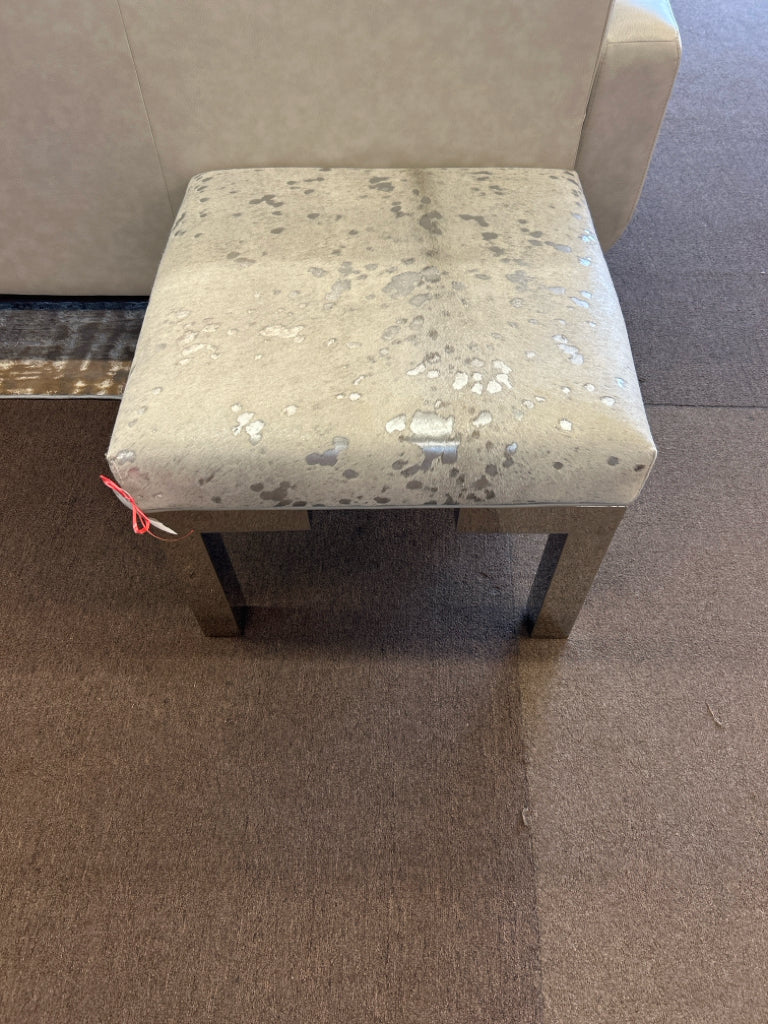 White/Silver Hair on Hide Upholstered Ottoman on Chrome Legs