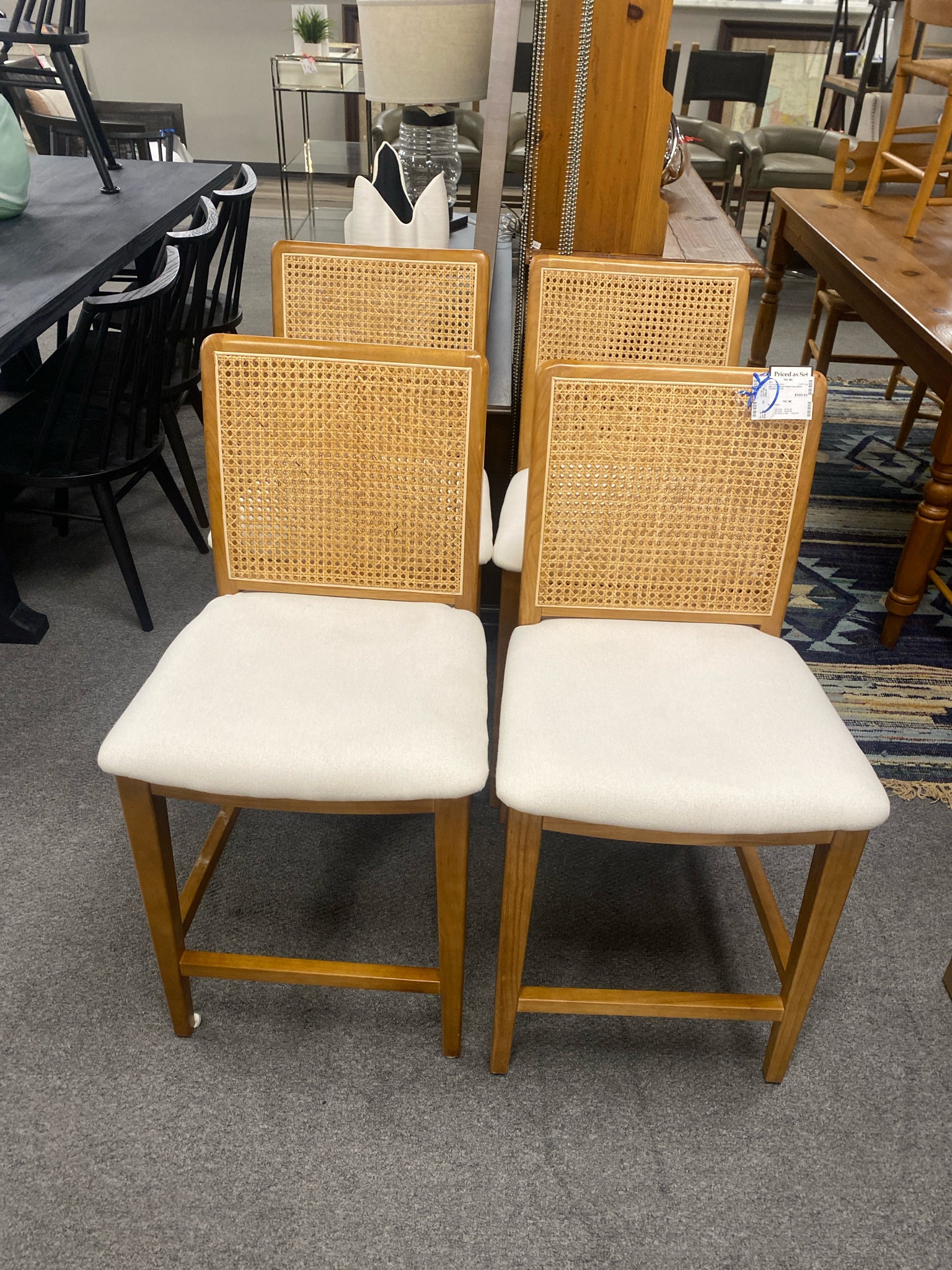 Set of 4 Natural Finish Cane-Back Counter Stools
