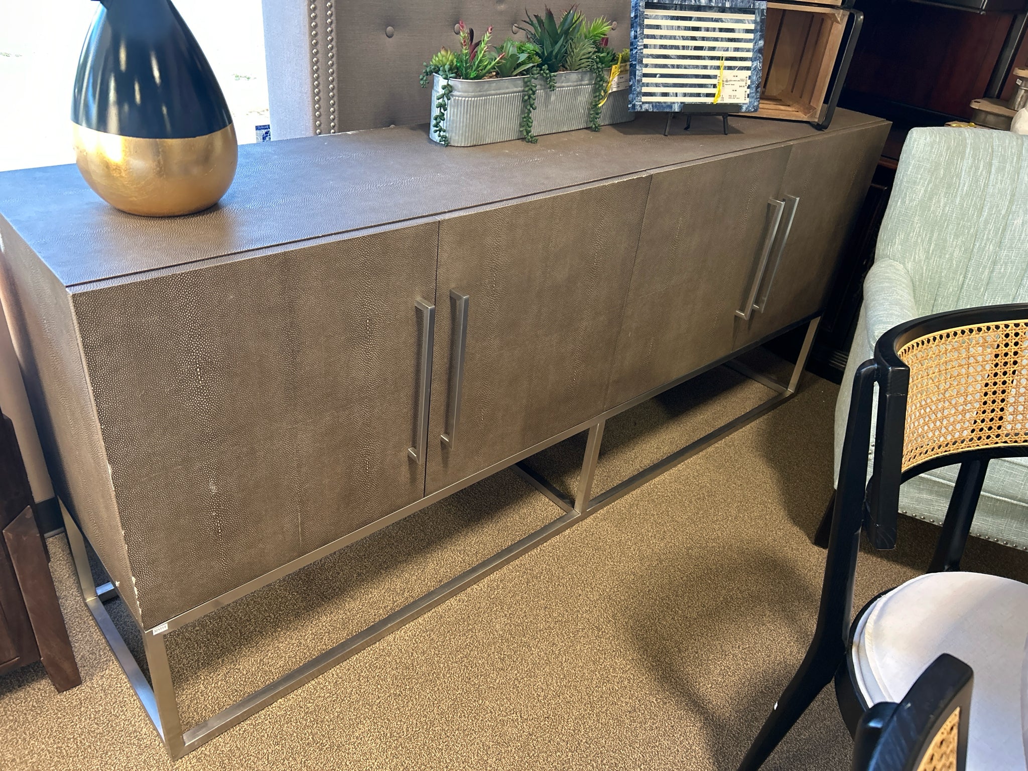 AS-IS-SHAGREEN SIDE BOARD W/FOUR DOORS 7 BRUSHED NICKEL BASE 83L 18D 36H