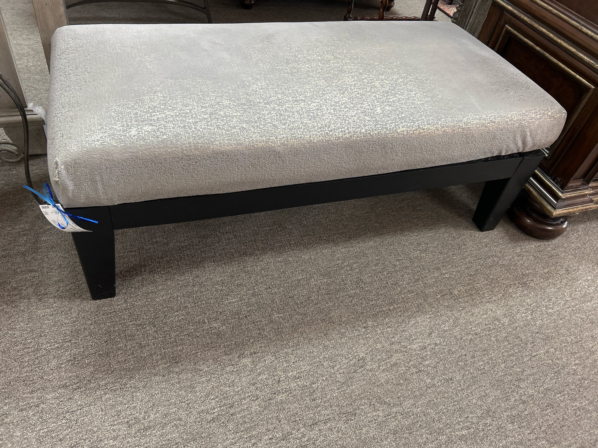 Grey Metallic Fabric Ottoman, Black Wood Legs. 47"x 22"x 16"tall