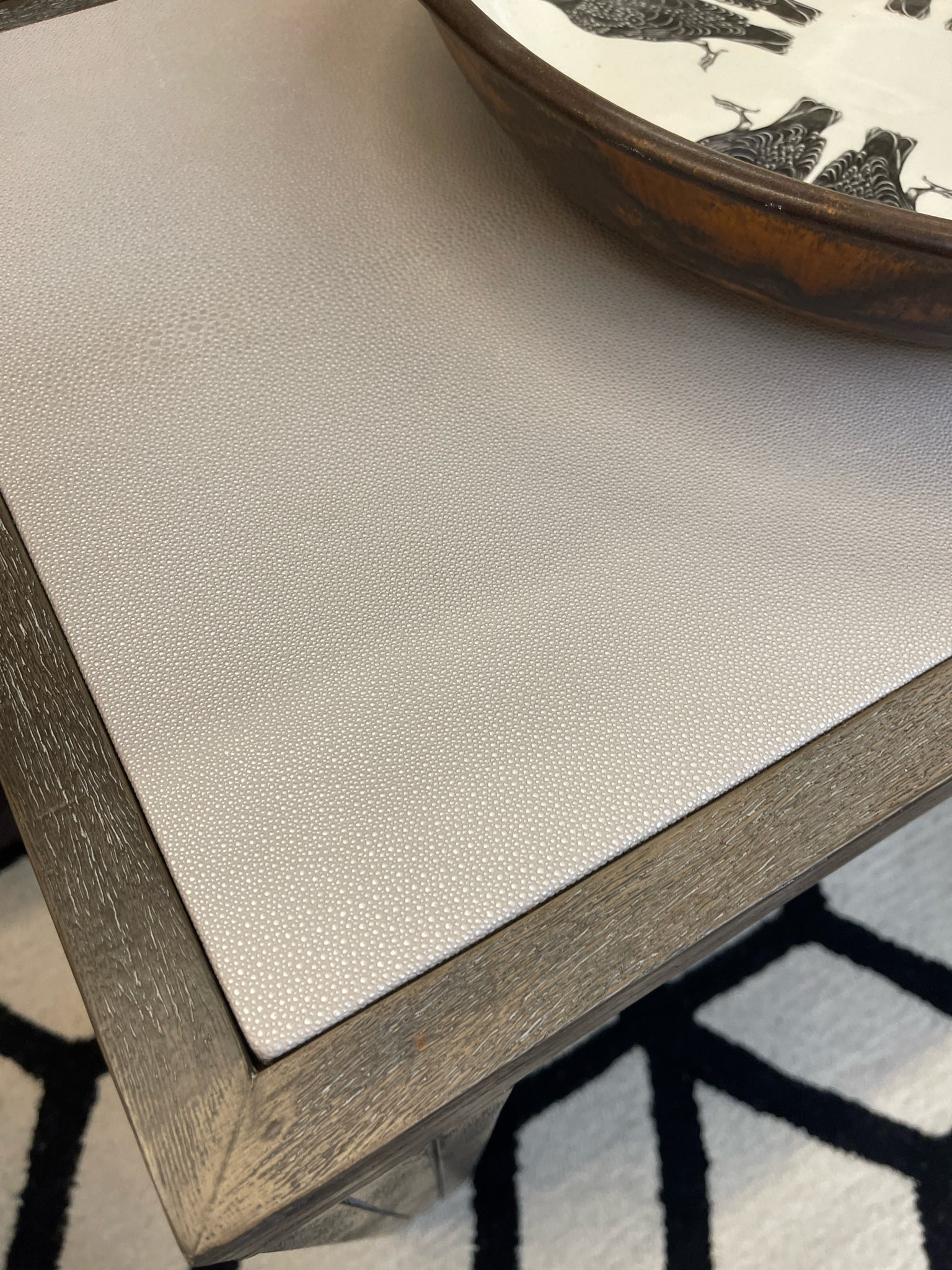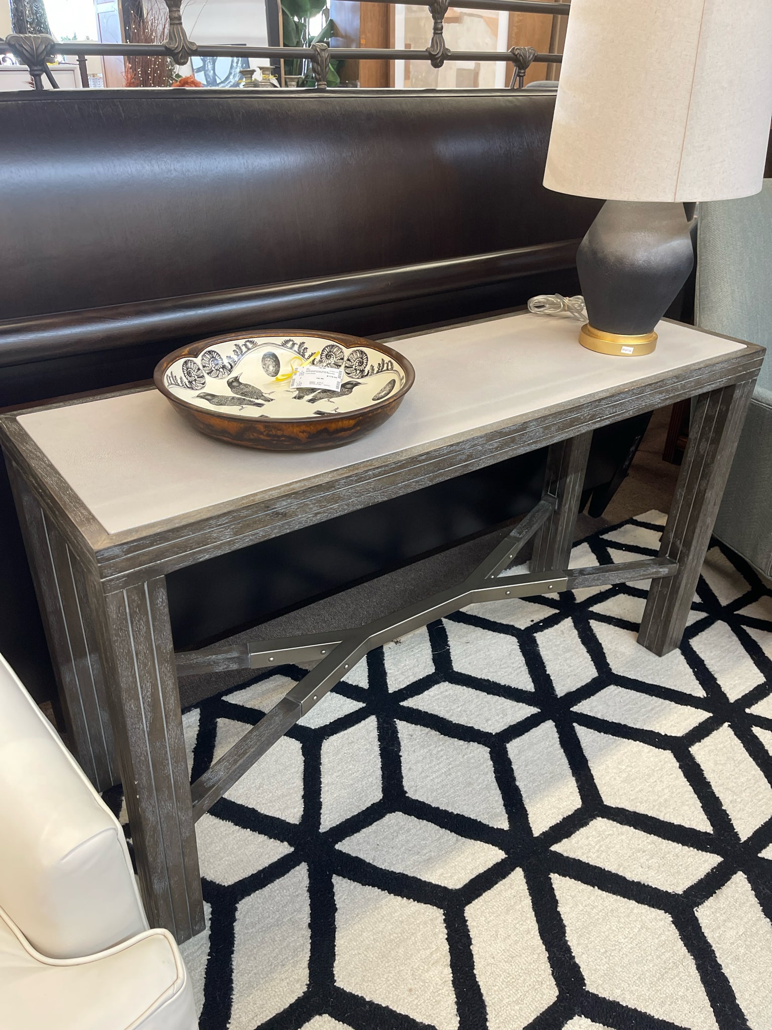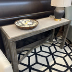 Brown w/Grey Wash Finish & Metal Accents, Beige Taupe Shagreen Inlaid Top 54"W 18"D 30.75"H