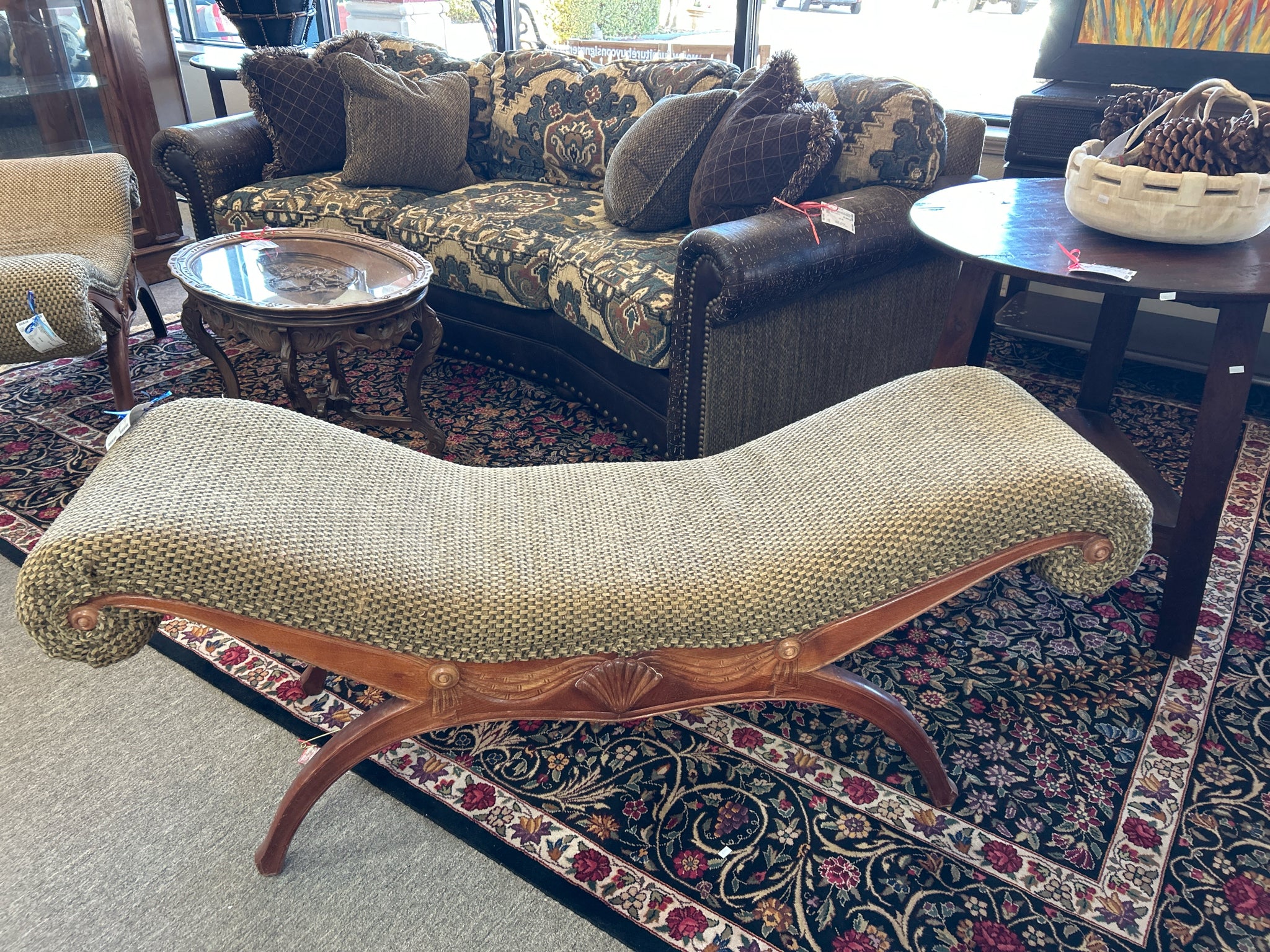 Gold Chenille Rolled Arm Bench w/Wood Base w/Shell Design - 54x18x23"h