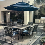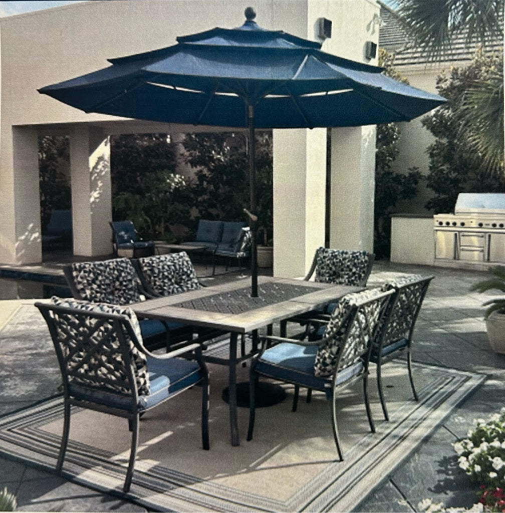 Set of 8 Black Frame Table w/Blue Umbrella & 6 Chairs w/Blue Cushions