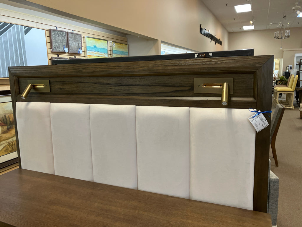 UPHOLSTERED IVORY QUEEN HEADBOARD W/DARK WOOD & READING LIGHTS