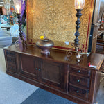 AS IS- Dark Cherry Finish Media Console with 2 Interchangeable Doors, 4 Drawers. 81x25 1/2x27"((wear on top)
